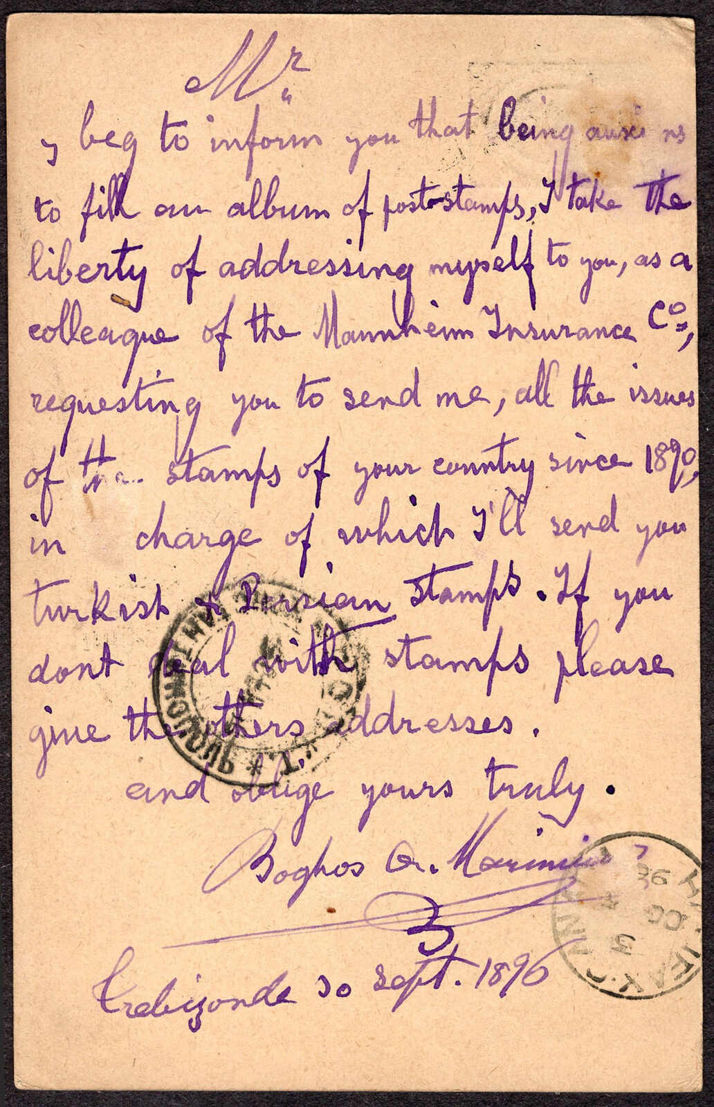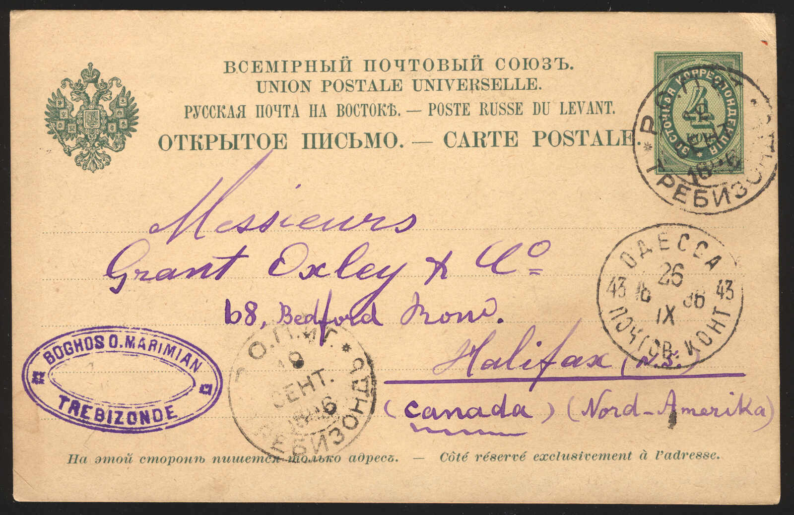 335 CVR   image1896 (September 19), 4k postal stationery card from Trebizond to Halifax, Nova Scotia, struck with two fine c.d.s. of ТРЕБИЗОНДЪ with ОДЕССА (Odessa, 26 Sep) transit on face, faint Halifax, N.S. (Oct) receiver, the reverse showing an English message offering stamps in philatelic exchange, routed from the ROPiT Trebizond agency by steamer to Odessa and onward to to Canada, a rare destination, fresh and very fine. (Image 1) (Image 2)