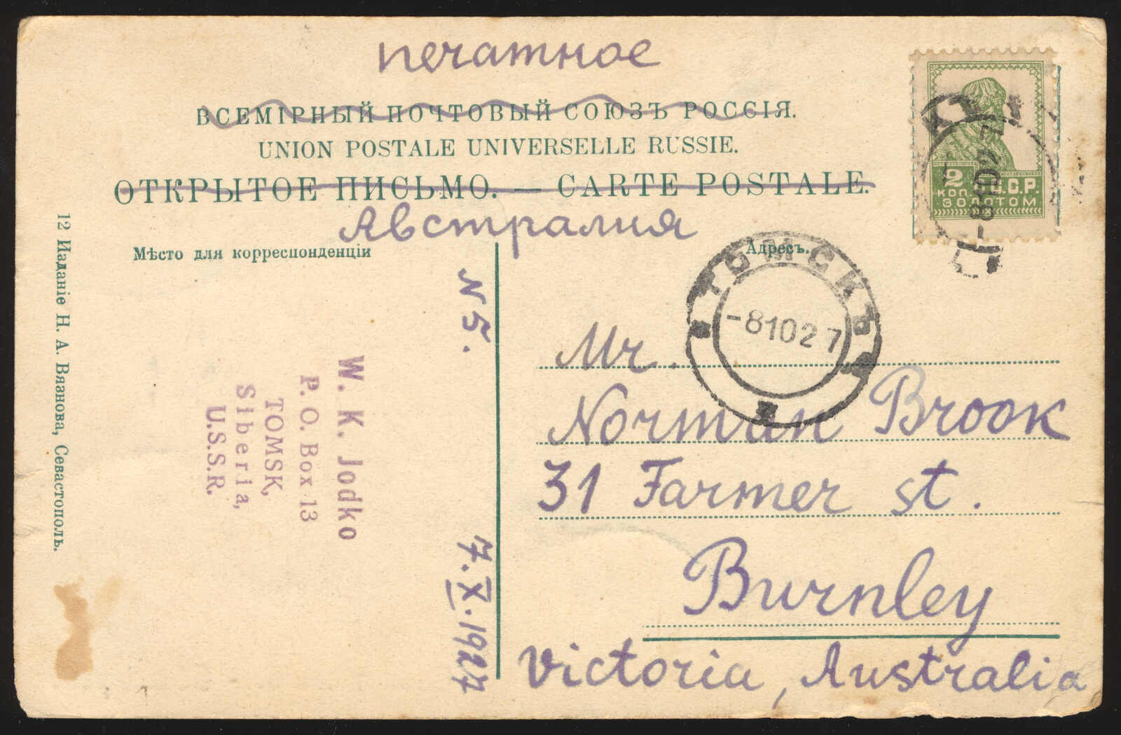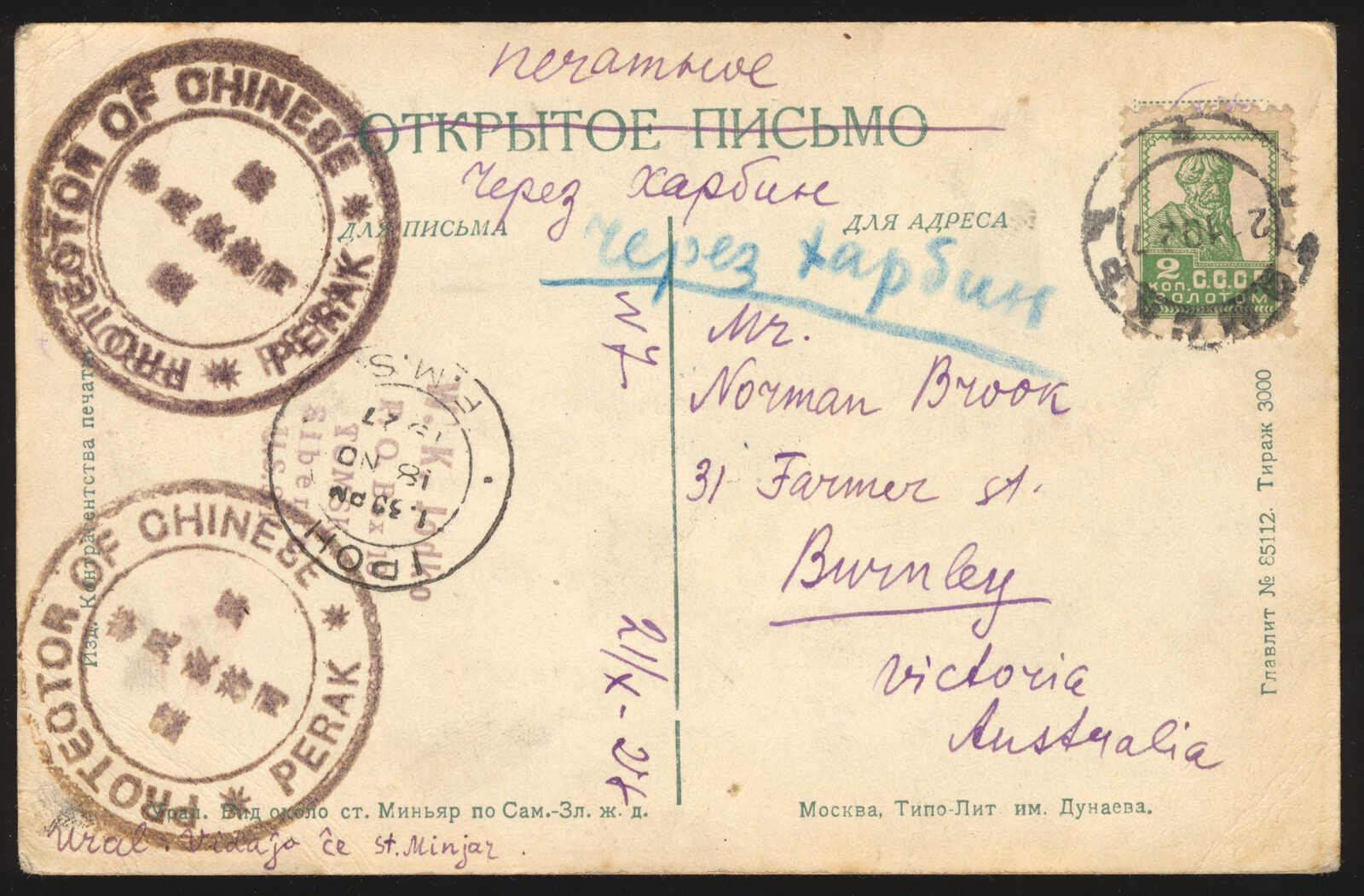 327 CVR   image1927 (October), two postcards from Tomsk, Siberia to Australia via Harbin and Ipoh, 2k Worker-franked picture postcards from the same correspondent in Siberia to Burnley, Victoria, Australia, the first depicting “Ural. View near Minyar Station” and tied by Tomsk (21 Oct) c.d.s. with manuscript endorsement “via Harbin”, routed eastward through Manchuria and China and struck with Ipoh, Perak (18 Nov) transit, the reverse bearing two large violet circular “Protector of Chinese / Perak” handstamps, used by the administrative body overseeing Chinese affairs, labour supervision and remittances; the second card, “Sevastopol – Le boulevard de la mer”, sent 13 days earlier on 8 Oct, showing identical franking and address yet no Malayan markings, evidently carried on a route other than the Trans-Siberian/Harbin line, a useful contrasting pair for the specialist, fine. (Image 1) (Image 2) (Image 3) (Image 4)