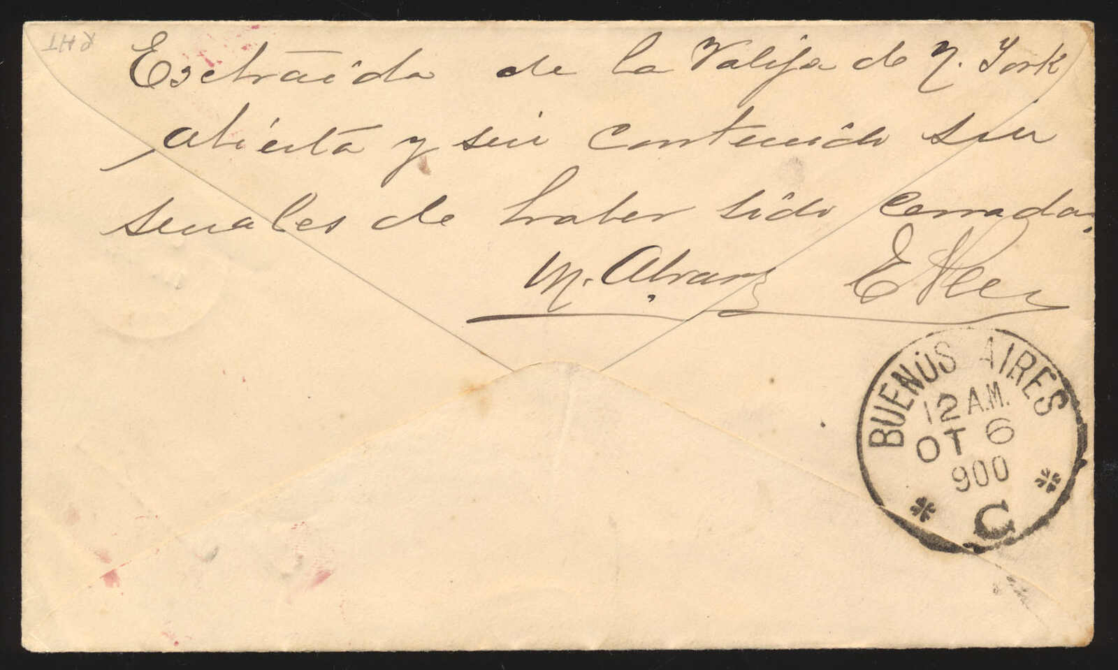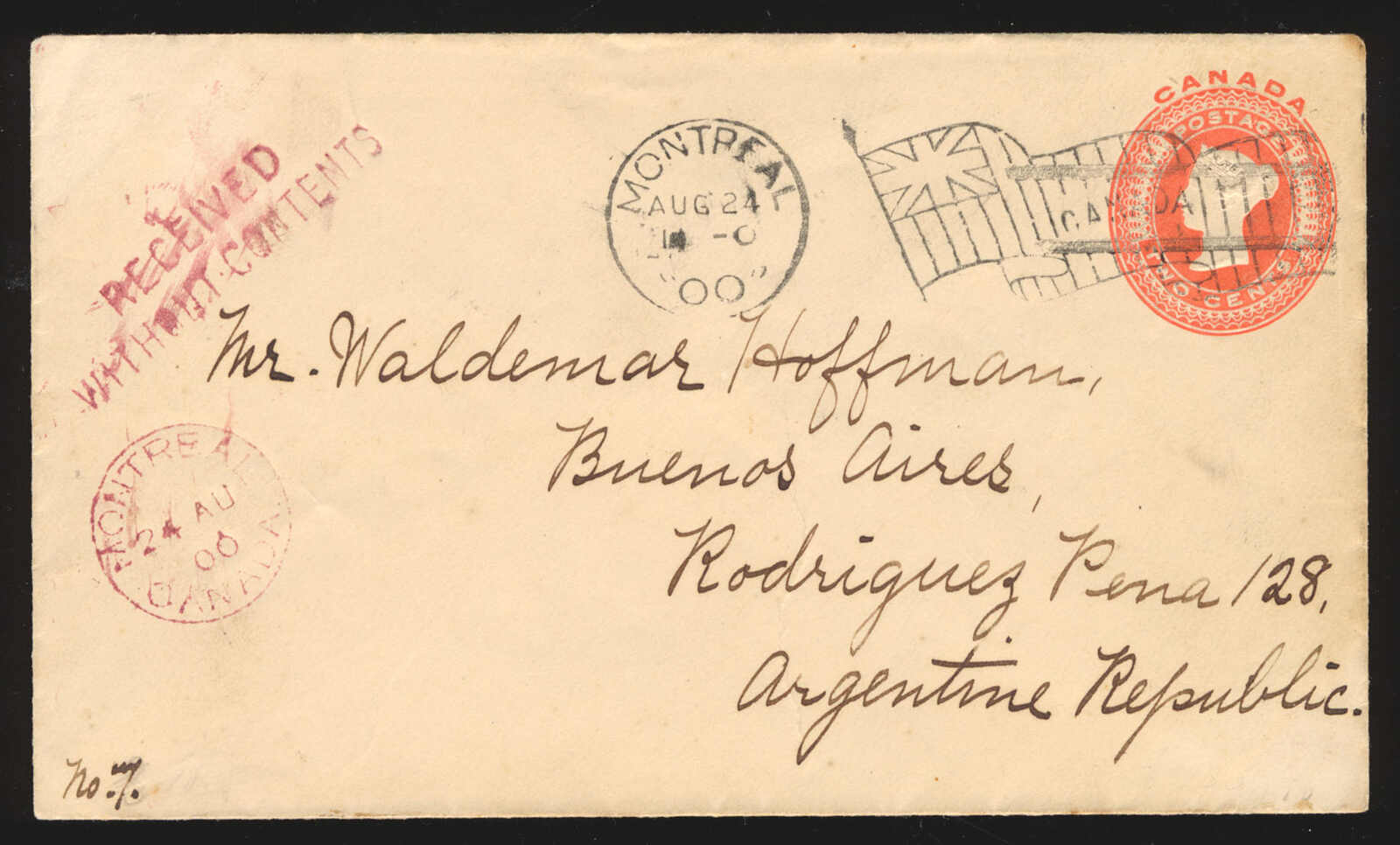 34 CVR EN13 image1900 (August 24), Montreal to Buenos Aires, Argentina, received without contents, 2c red Queen Victoria postal stationery envelope to Buenos Aires, tied by Montreal flag cancel, with matching red Montreal circular datestamp at left, struck with bold red two-line “RECEIVED / WITHOUT CONTENTS” handstamp, and on reverse a manuscript notation in Spanish reading “Extraída de la valija de N. York abierta y sin contenido sin señales de haber sido cerrada” (“Taken from the New York mailbag, open and without contents, with no signs of having been sealed”), signed twice by postal officials, further struck with Buenos Aires “C” receiver (6 Oct), fllap unsealed, correctly sent at the 2c UPU printed-matter rate, a lovely printed-matter usage to Argentina, very fine. (Image 1) (Image 2)