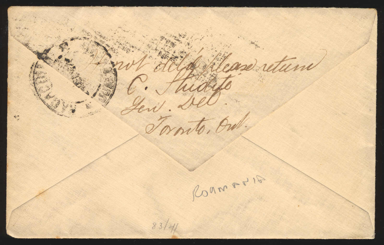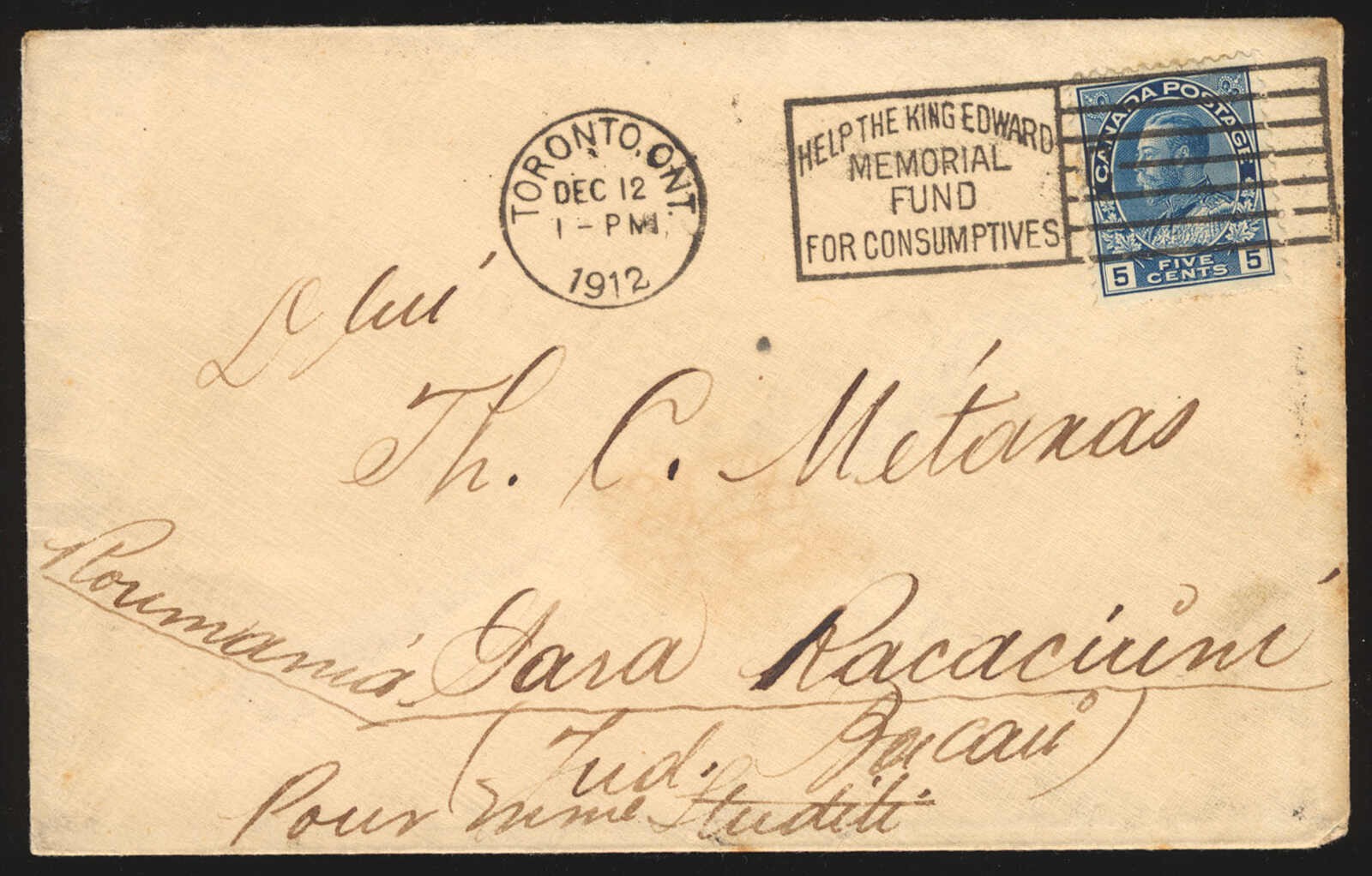 36 CVR 111 image1912 (December 12), 5c blue Admiral single franking on cover from Toronto, Ont. to Răcăciuni, Romania, paying the UPU letter rate, tied by crisp Toronto slogan cancel “Help the King Edward Memorial Fund for Consumptives,” reverse with double-circle Răcăciuni receiver (24 Dec), a scarce destination in the pre-war period, likely routed via Paris and Bucharest, some light toning, else fine-very fine and desirable. (Image 1) (Image 2)