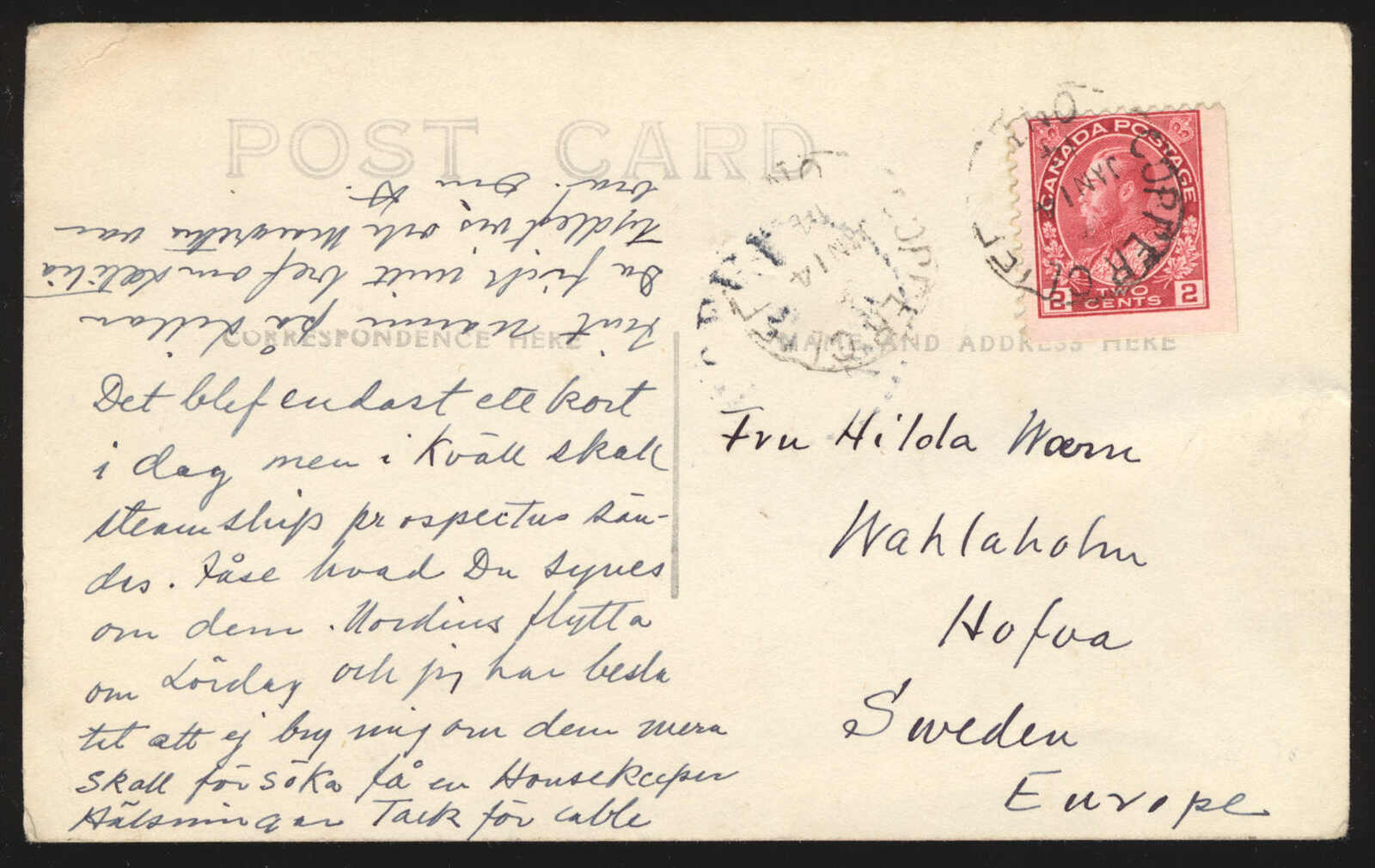 39 CVR 106a image1914 (January 14), 2c Admiral booklet stamp on postcard from Copper Cliff to Sweden, the (squat printing) Admiral tied by Copper Cliff, Ont. c.d.s., sepia view card depicting the Finnish Church, correctly sent at the postcard rate to an elusive Scandinavian destination, fine to very fine. (Image 1) (Image 2)