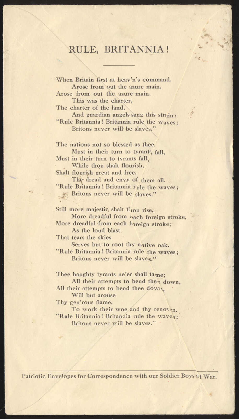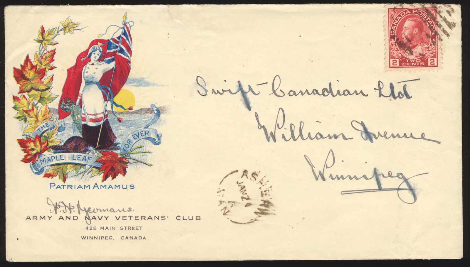 40 CVR 106 image1915 (January 21), Toronto to Ashern Army and Navy Veterans’ Club patriotic cover with contents, franked with 2c carmine Admiral tied by undated Visit Postal Exhibit / Toronto Exhibition slogan cancellation, Ashern, Manitoba c.d.s. receiver (28 Aug) on back, mailed unsealed and containing advertising enclosure including self-addressed return envelope and printed lyrics to Rule Britannia! on reverse, a bit of rough opening, otherwise fine to very fine. (Image 1) (Image 2)