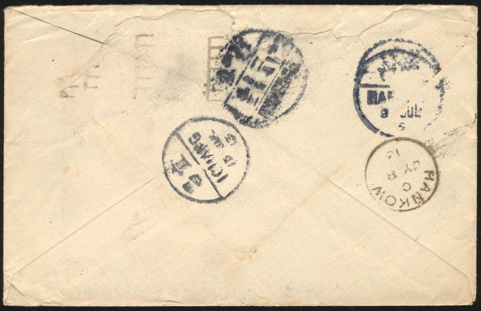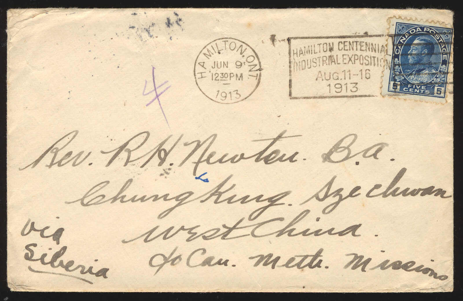 37 CVR 111 image1913 (June 9), Hamilton to Szechuan, China cover from the Newton correspondence, franked with 5c blue Admiral, paying the UPU rate and tied by Hamilton Centennial Industrial Exposition slogan cancellation, addressed via Siberia to the Canadian Methodist Missions, multiple transit markings including Hankow c.d.s. (8 Jul) on reverse, fine to very fine. (Image 1) (Image 2)