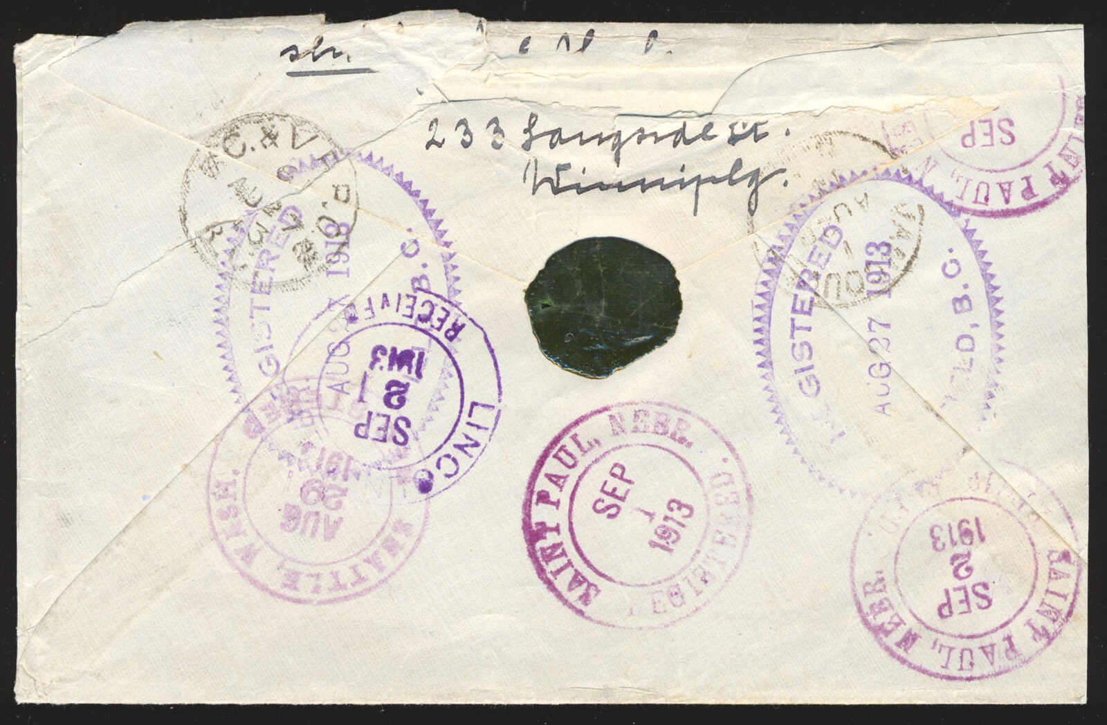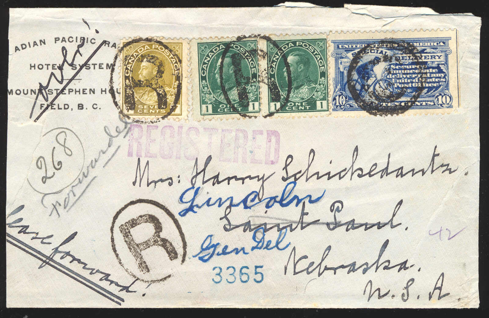 38 CVR 104.113 image1913 (August 29), British Columbia to Nebraska, registered cover with U.S. Special Delivery stamp, franked with pair of 1c green and single 7c yellow ochre Admirals tied by R handstamps, together with 10c blue U.S. Special Delivery stamp, the reverse showing black wax seal and numerous transit and receiver markings, somewhat roughly opened, otherwise a fine and uncommon franking. (Image 1) (Image 2)