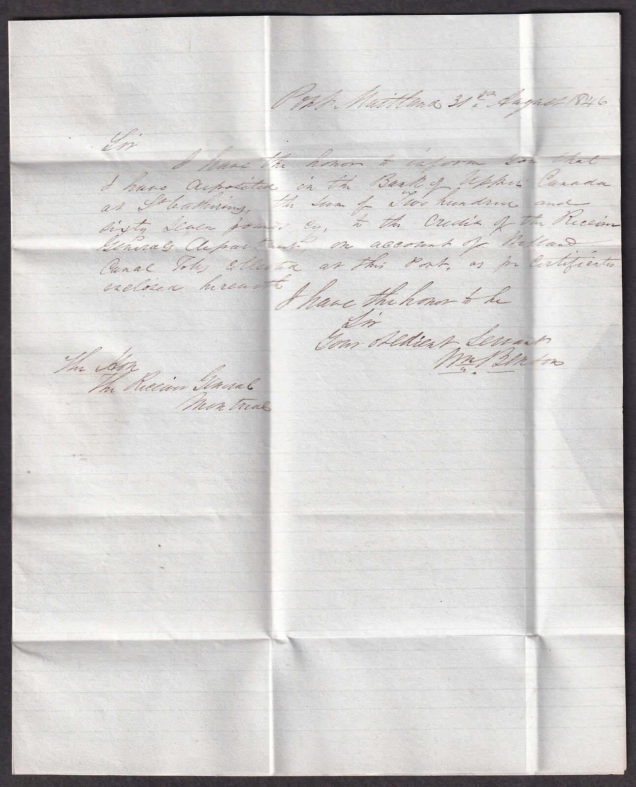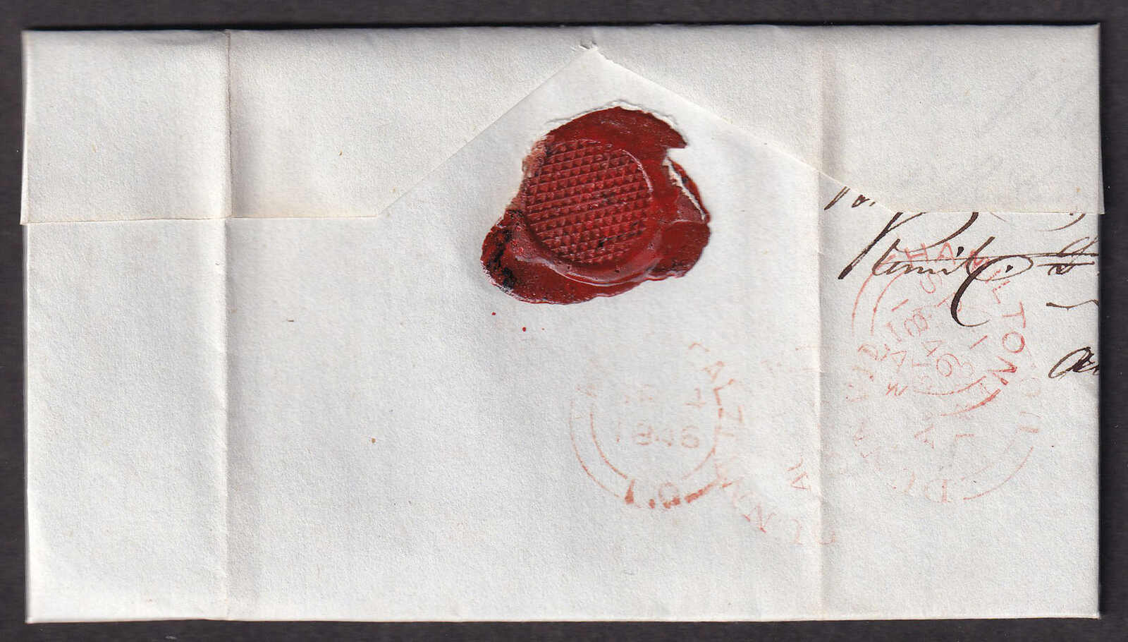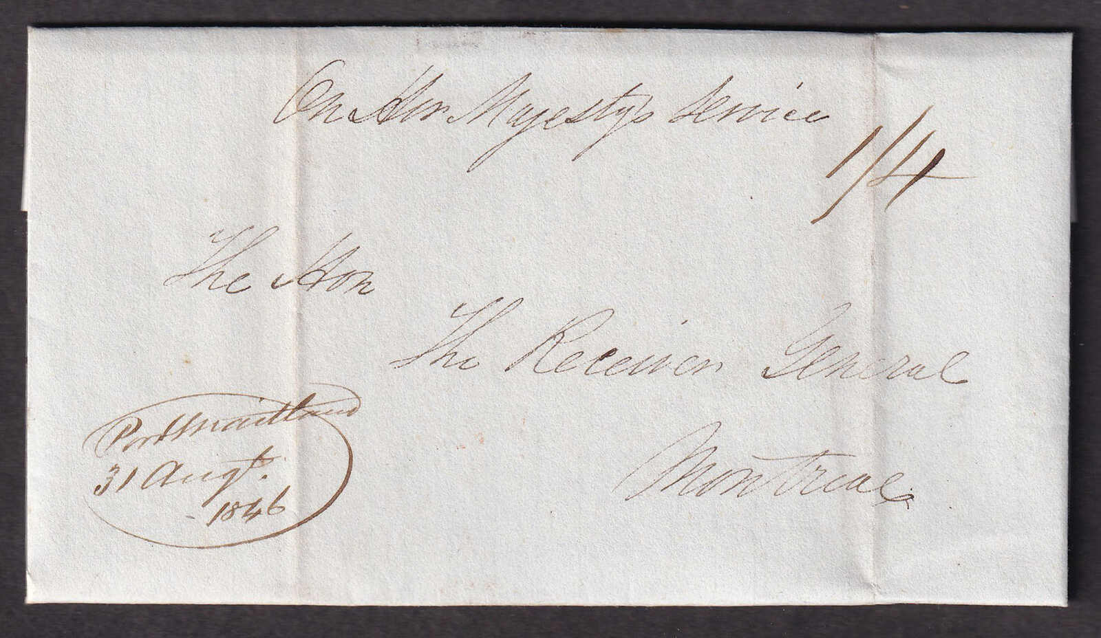 27 CVR   image1846 (August 31), Port Maitland, Ontario, manuscript cancel on stampless folded letter, with commercial contents, endorsed "On Her Majesty's Service", rated ¼d, to Montreal, with clear manuscript cancel at lower left, reverse with Dunnville (31 Aug), Hamilton (1 Sep), and Montreal (4 Sep) backstamps, typical filing folds, else fresh and very fine. (Image 1) (Image 2) (Image 3)