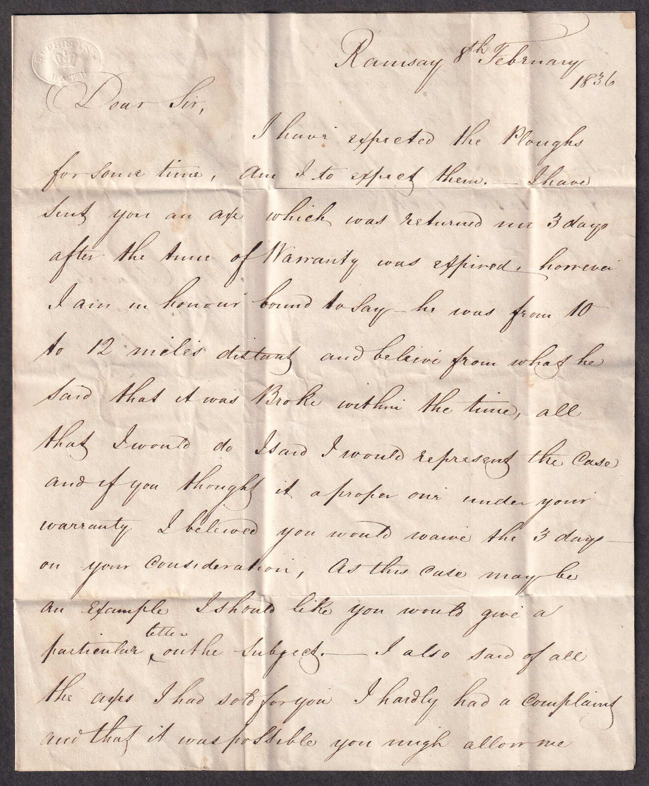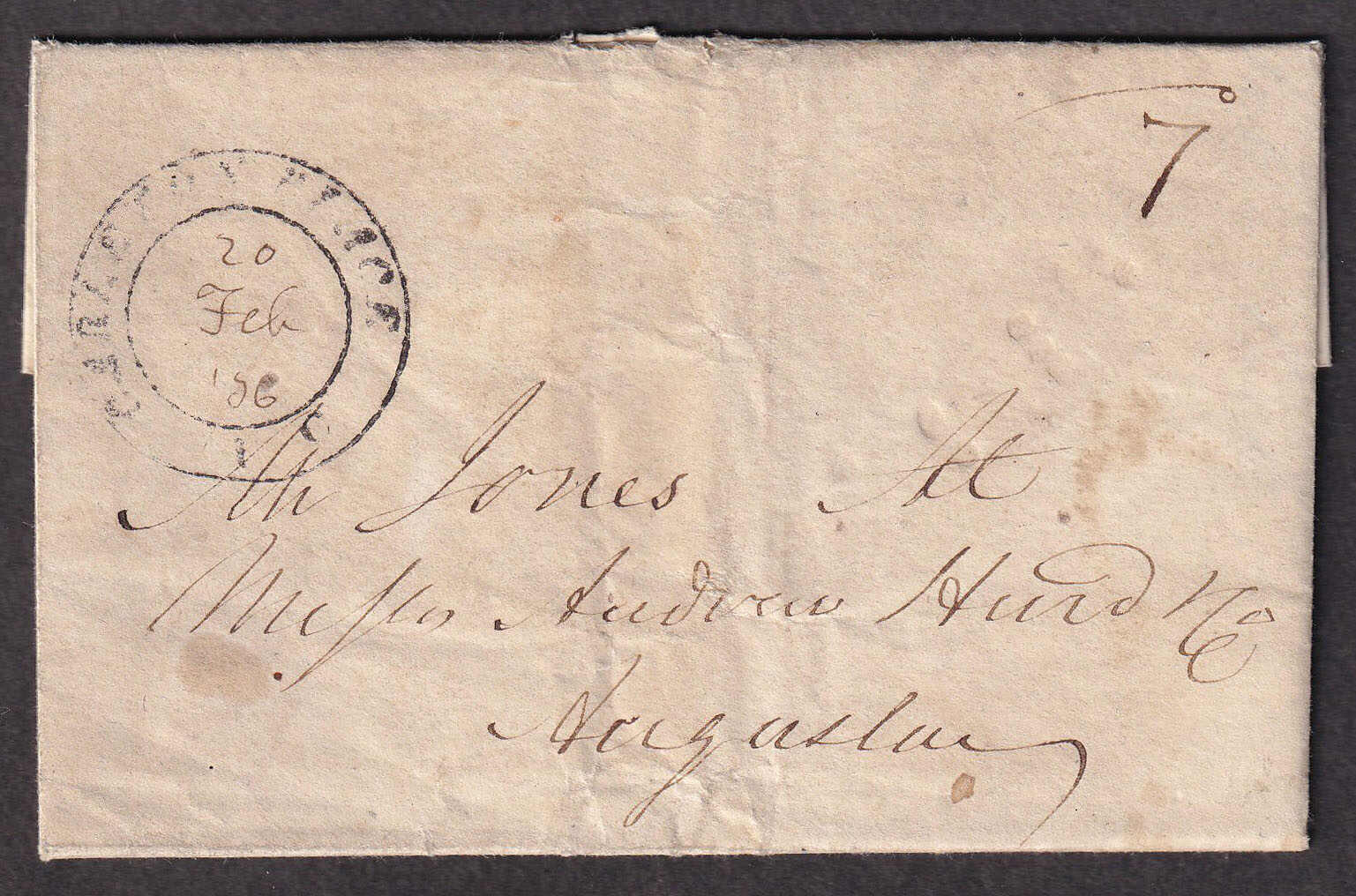 24 CVR   image1836 (February 20), Carleton Place to Augusta, stampless folded letter, with contents datelined Ramsay, rated 7d in manuscript and struck with fair Carleton Place / UC double-circle, with date in manuscript, some wrinkles, else a fine Lanark County cover; the Ramsay Post Office opened the following year. (Image 1) (Image 2) (Image 3) (Image 4)