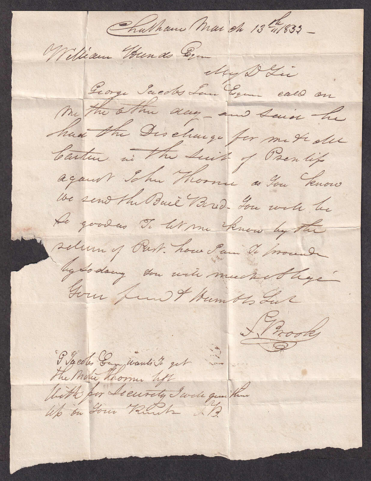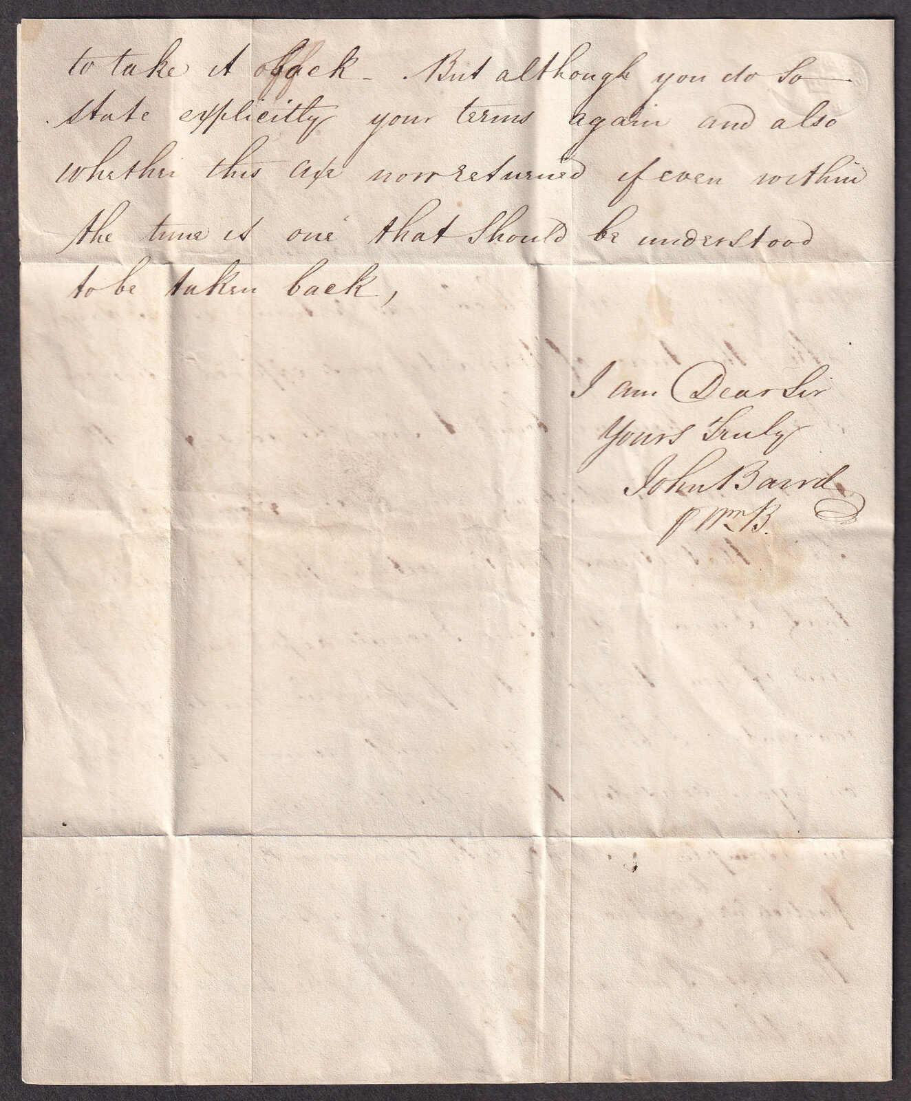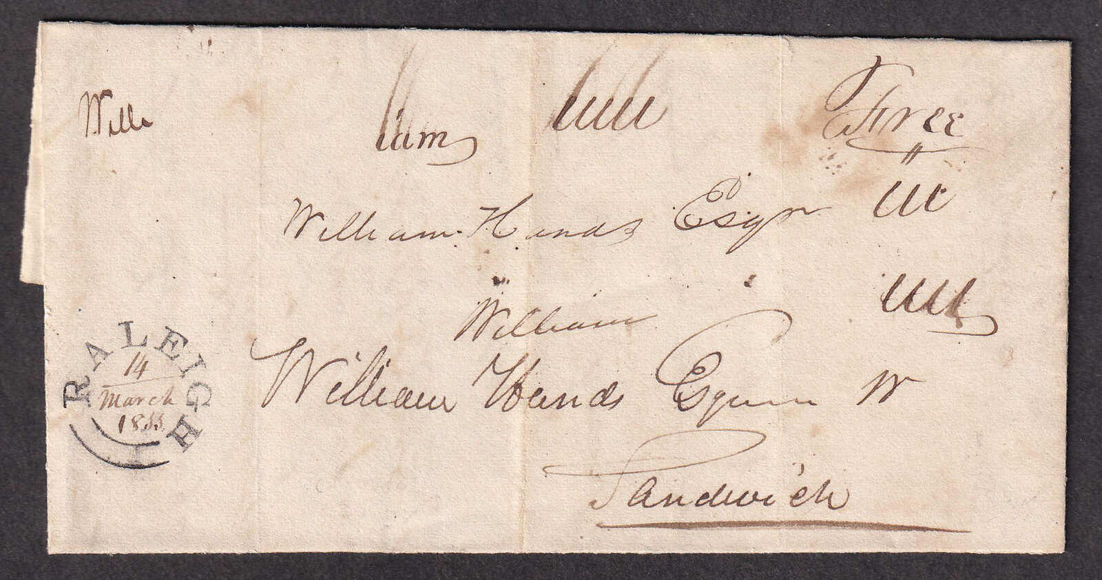 23 CVR   image1833 (March 14), Raleigh to Sandwich, stampless "Free" letter, with contents signed "S. Brooks", rated "Free" in manuscript, and struck with crisp Raleigh double split-ring (date in manuscript), usual filing folds, else fresh and very fine. (Image 1) (Image 2) (Image 3)
