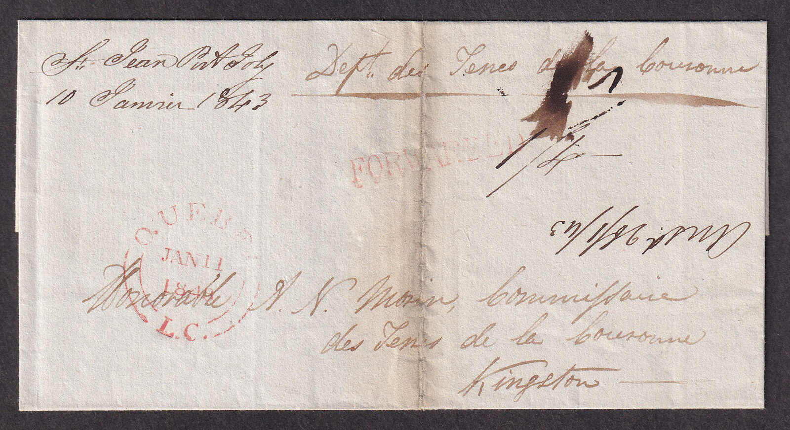 25 CVR   image1843 (January 10), St. Jean Port Joli manuscript cancel on forwarded cover to Kingston, stampless folded cover, without contents, rated in manuscript and with "St. Jean Port Joly / 10 Janvier 1843" manuscript cancel at upper left, rated in manuscript and struck with FORWARDED straight-line and Quebec L.C. double split-ring (11 Jan) in red, without backstamps, vertical filing fold, else quite fresh. (Image 1) (Image 2)