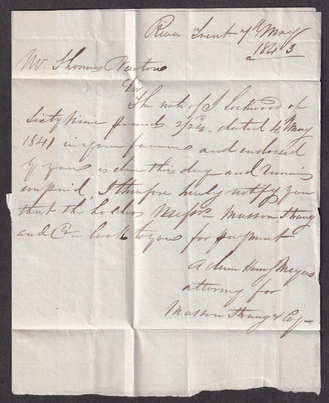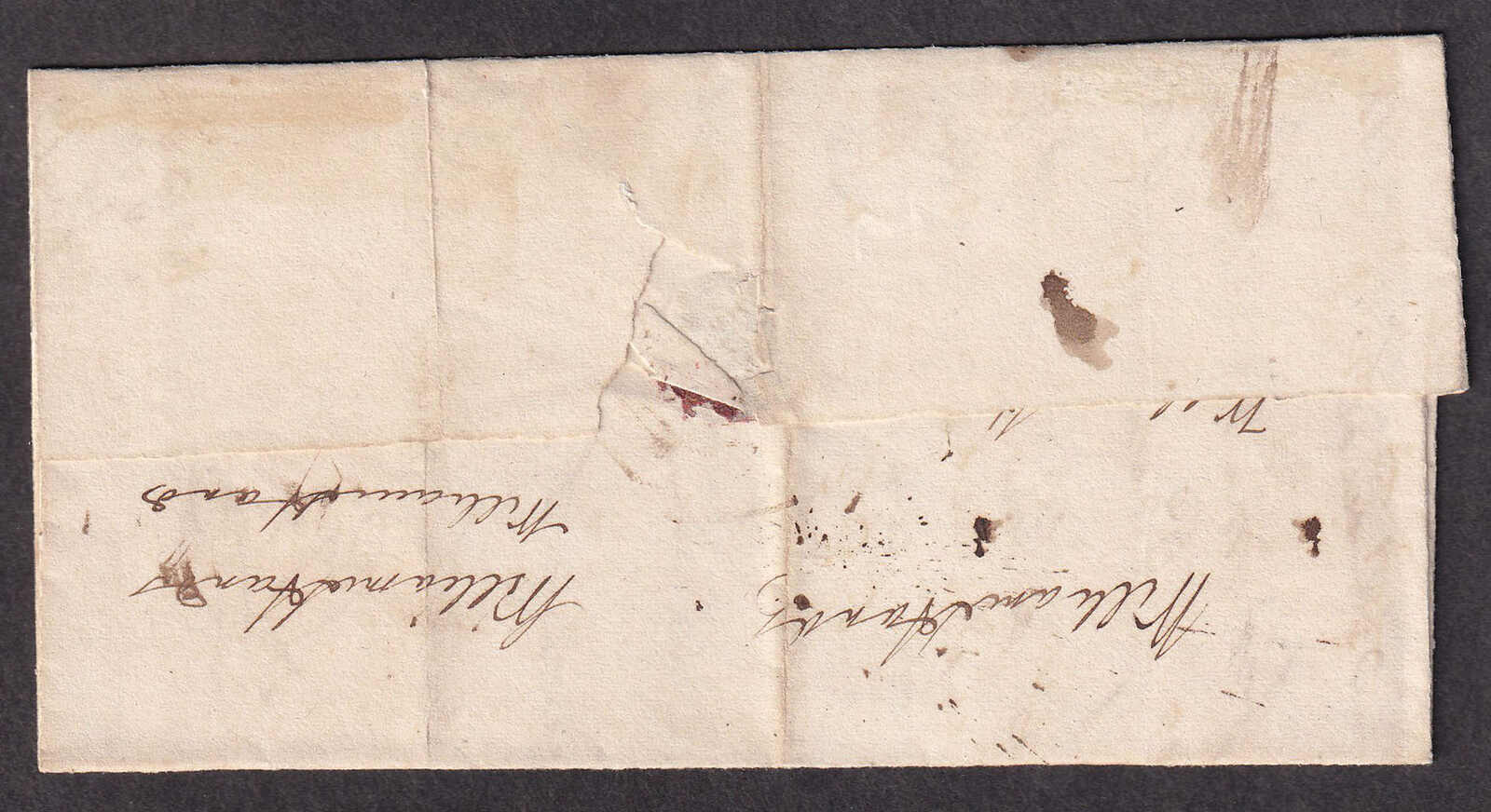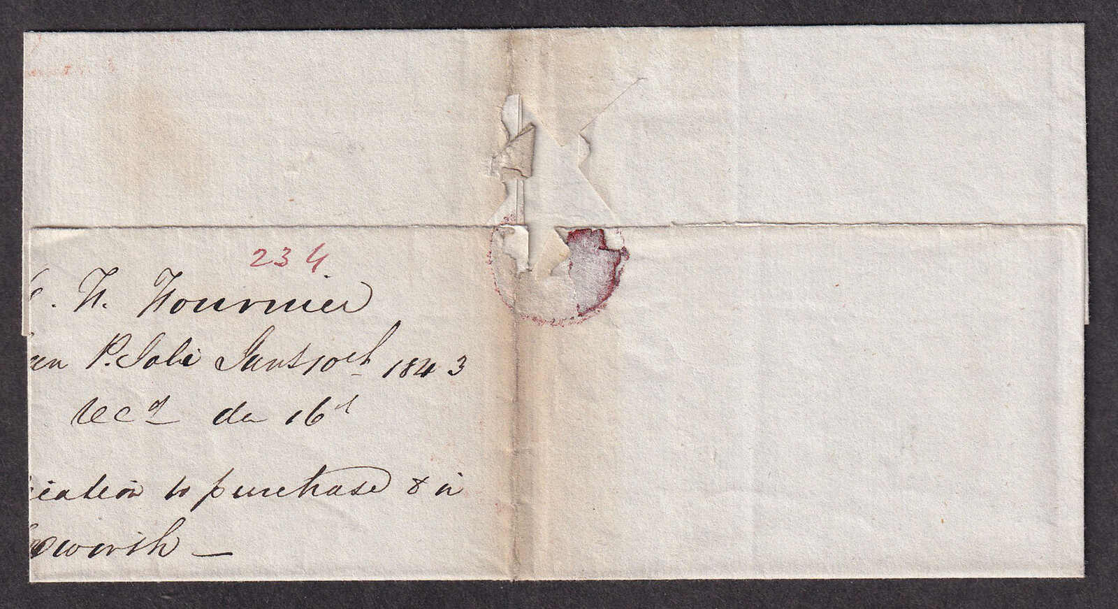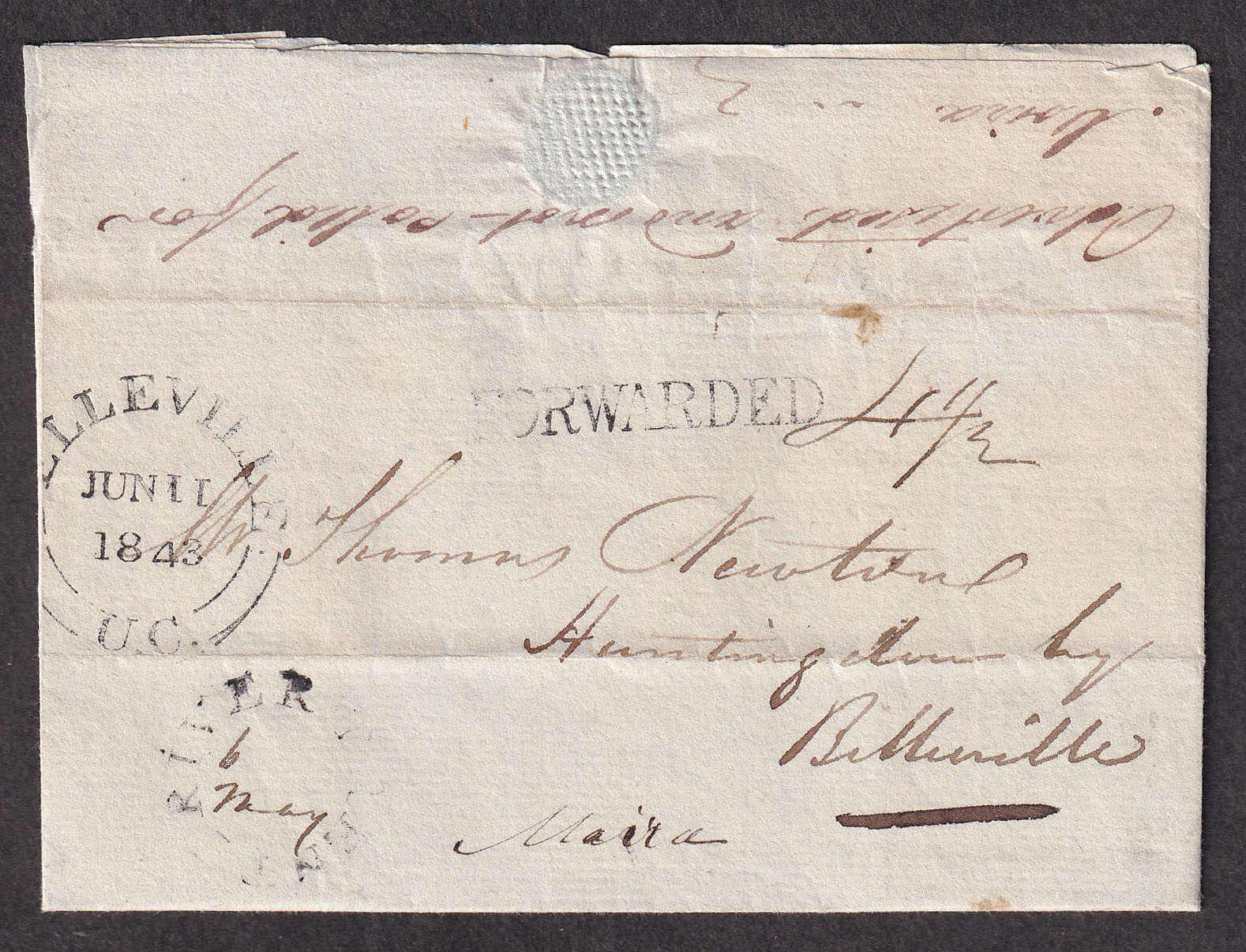 26 CVR   image1843 (May 6), River Trent to Belleville, advertised & not called for, stampless folded letter, with commercial contents, rated 4-¼d, struck with light River Trent double split-ring despatch, to "Huntingdon by Belleville", with crisp Belleville receiver on front (11 Jun), noted on reverse 'advertised and not called for' and struck with black FORWARDED straight-line, quite fresh. (Image 1) (Image 2) (Image 3)