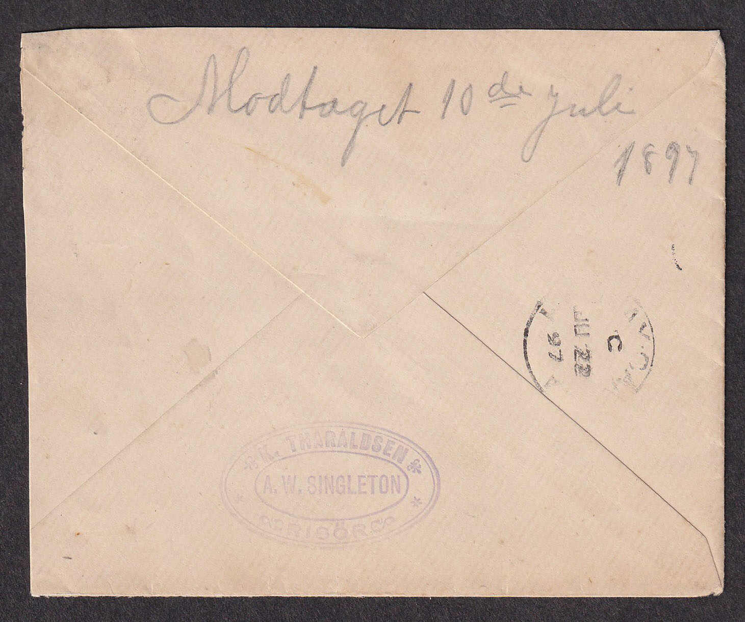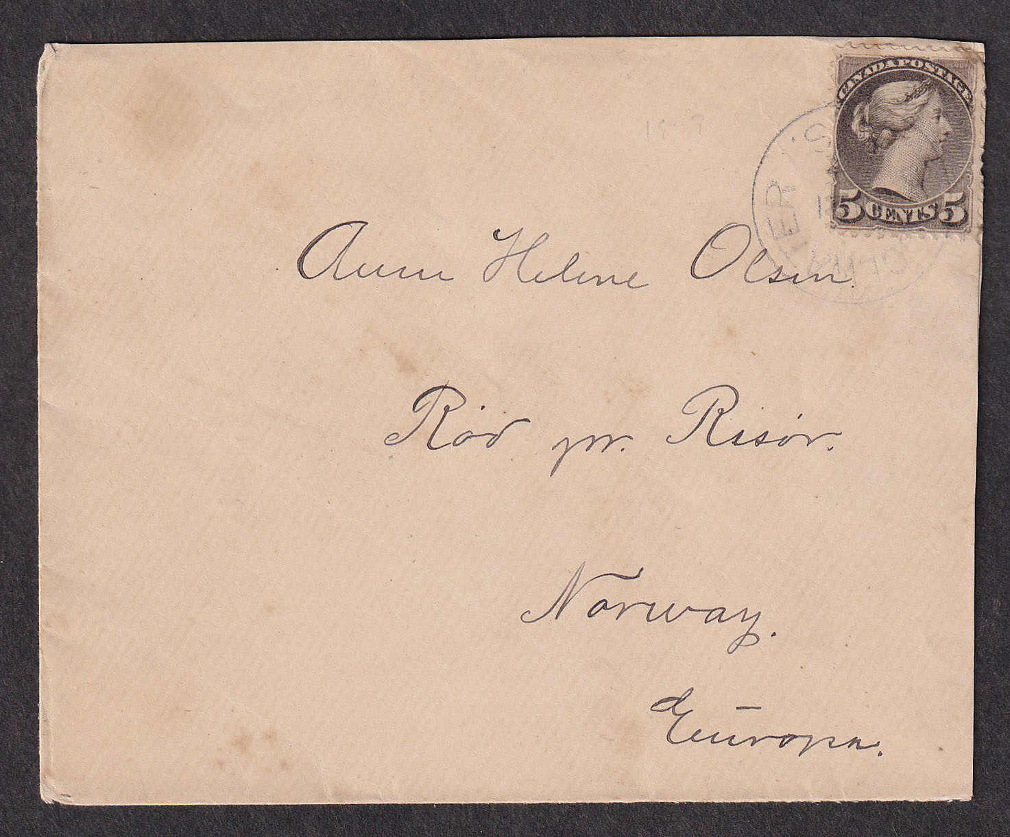 31 CVR   image1897 (June), Small Queen cover from Bridgewater to Risør, Norway, cover franked with 5c Small Queen, tied by Bridgewater c.d.s., to Rod / Risør, with Halifax c.d.s. transit backstamp (22 Jun), the odd tone spot, cover slightly reduced at right, barely touching top right perfs, else an attractive cover to a scarce foreign destination, Risør being a small coastal town in southern Norway. (Image 1) (Image 2)
