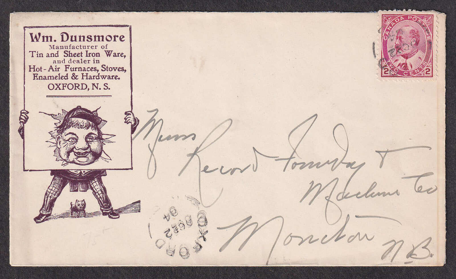 35 CVR   image1904 (October 22), Oxford, Nova Scotia, illustrated advertising cover, to Moncton, New Brunswick, franked with 2c King Edward VII, tied by Oxford split-ring, free strike at bottom, reverse with same-day c.d.s. arrival backstamp, at left a comic illustration promoting the firm of Wm. Dunsmore, manufacturer of tin and sheet iron ware, and dealer in hot-air furnaces, stoves, and hardware, stamp slightly affixed over top of cover, else a fresh and most attractive advertising cover. (Image 1) (Image 2)