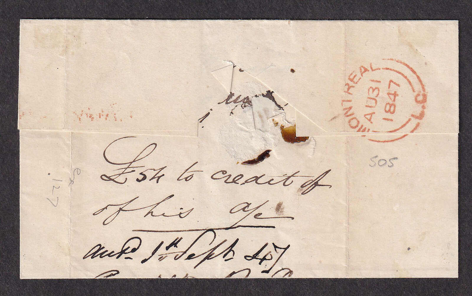 28 CVR   image1847 (August 30), Berthier to Montreal, stampless Money Letter, without contents, rated 4½d for a letter weighing under ½oz and delivered within 60 miles, postmarked with Berthier double split-ring despatch in blue, struck with MONEY-LETTER straight-line in matching ink, further MONEY-LETTER in red struck on arrival in Montreal, additional "Money Letter" endorsement in manuscript, reverse with next-day Montreal receiver, a lovely cover. (Image 1) (Image 2)