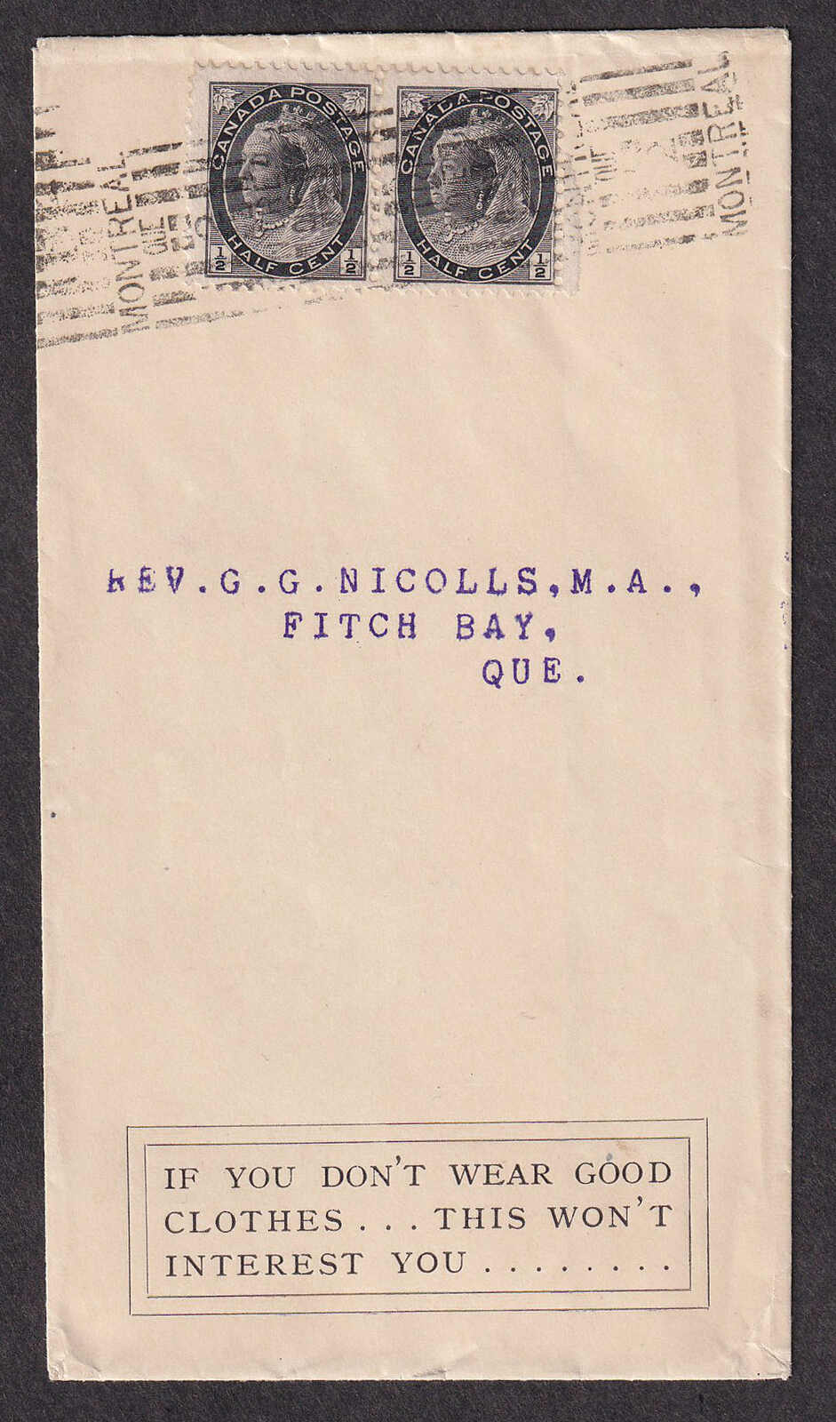 33 CVR 74 image1898, ½c Numeral pair on printed circular cover, tied by Montréal roller cancel, to Fitch Bay, Québec, with advertising text at bottom "If you don't wear good clothes…this won't interest you…" with c.d.s. arrival backstamp (5 Jun), an attractive example of this uncommon rate. (Image 1) (Image 2)