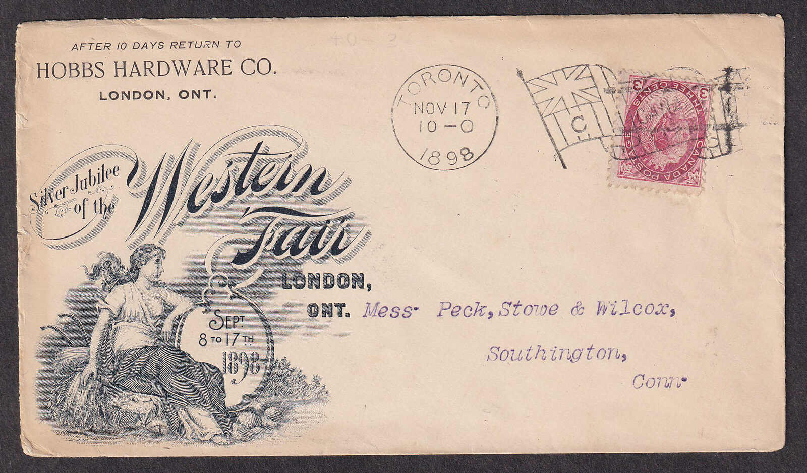 32 CVR   image1898 (November 17), Silver Jubilee of the Western Fair, London, Ontario, advertising cover franked with 3c Numeral, tied by Toronto flag cancel (indicia 'C'), to Southington, Connecticut, with next-day arrival backstamp, an attractive exhibition advertising cover. (Image 1) (Image 2)