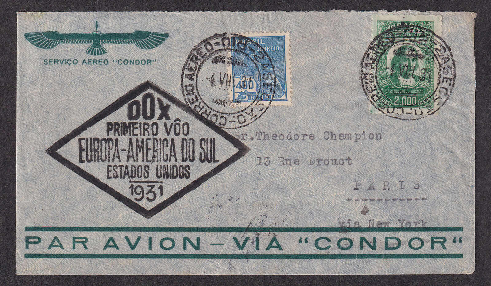 21 CVR   image1931 (August 5), DO-X flight cover to Paris, mailed at Rio de Janeiro on August 4 with bold DO-X confirmation diamond handstamp on front, the reverse showing New York transit machine cancel and Paris receiver c.d.s. (8 Aug), a clean and attractive example of this South Atlantic flight, overall very fine; ex L.V. Pont. (Image 1) (Image 2)
