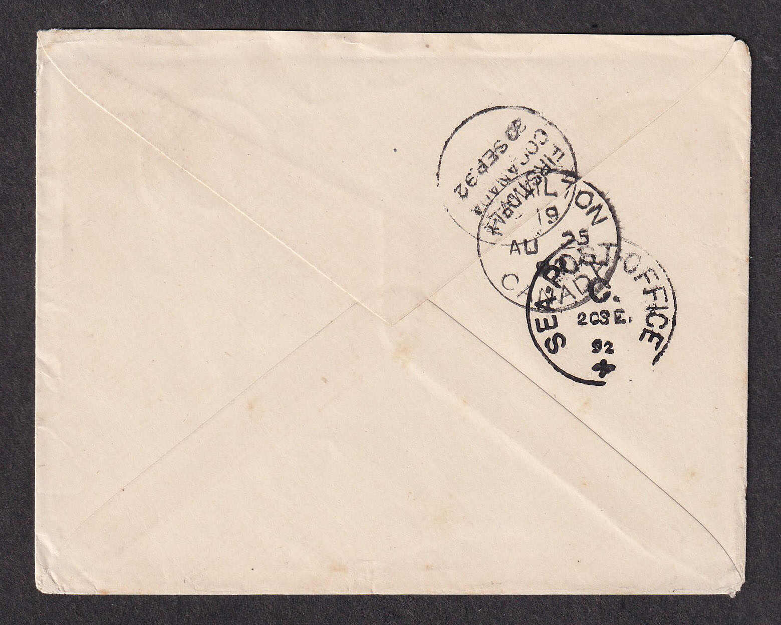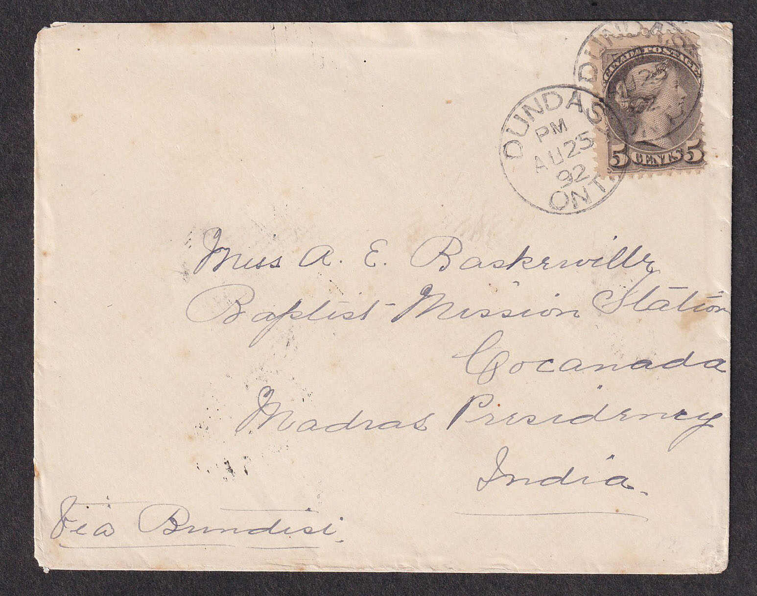 29 CVR   image1892 (August 25), Dundas to Madras, India, 5c Small Queen cover, tied by dual strikes of crisp Dundas c.d.s., to the Baptist Mission Station in Cocanada, Madras Presidency, endorsed "via Brindisi" in manuscript, reverse with Hamilton (25 Aug), Sea Post Office (20 Sep) and Cocanada transit/arrival backstamps, a desirable destination, better quality than often encountered. (Image 1) (Image 2)
