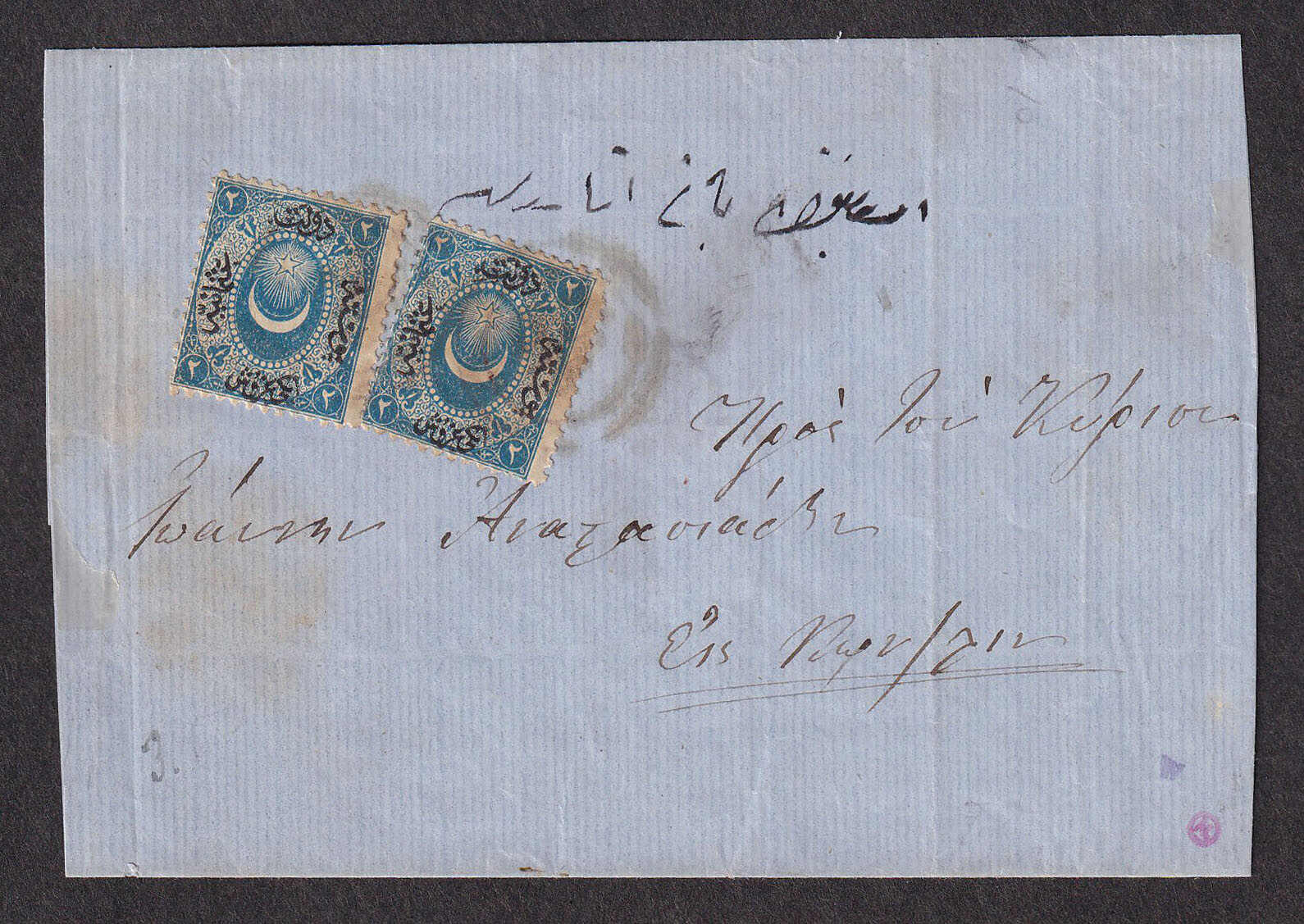22 CVR   imageOttoman Bulgaria, 1866 (June 12), folded cover from Plovdiv to Istanbul, franked with two 1865 20pa Crescent & Star, tied by indistinct double-circle c.d.s., reduced at sides, stamps somewhat toned, an otherwise fine and uncommon origin. (Image 1) (Image 2)