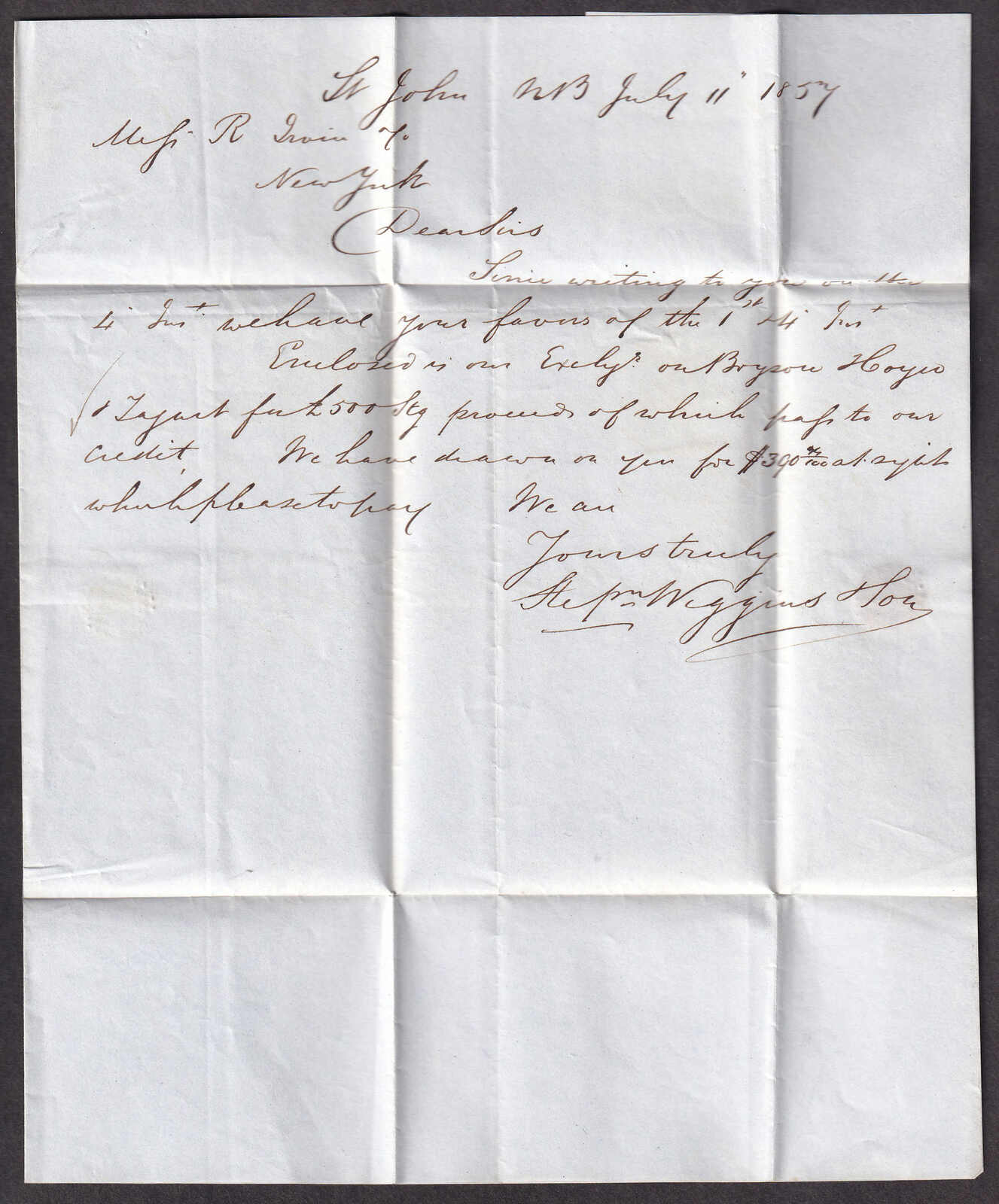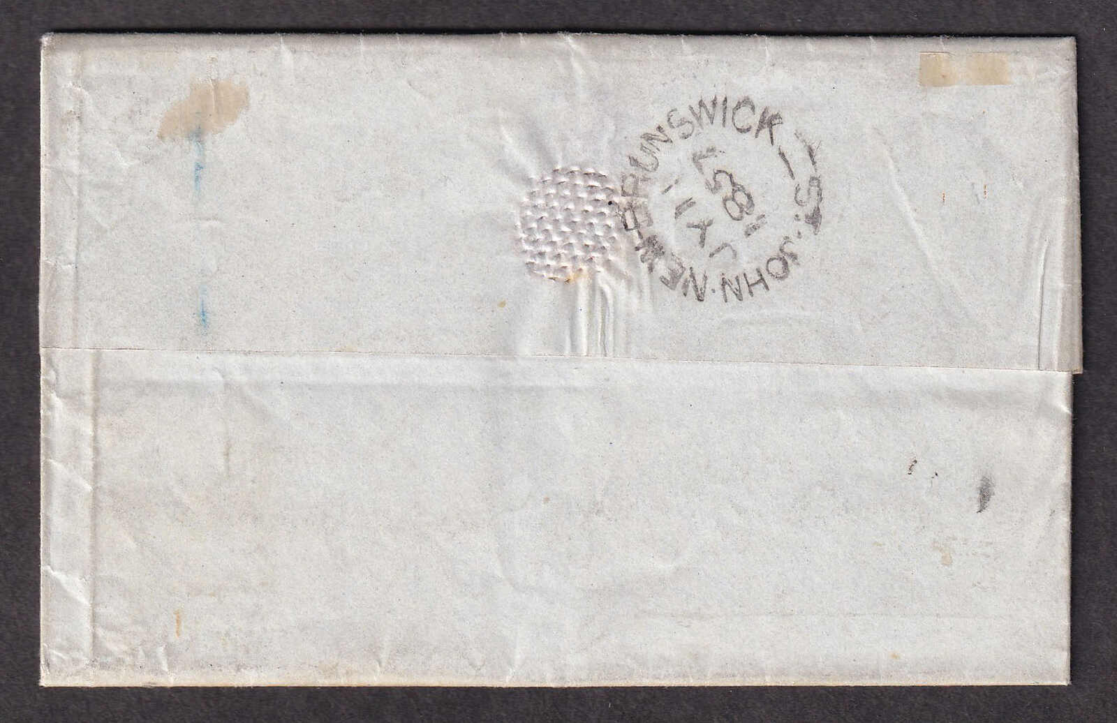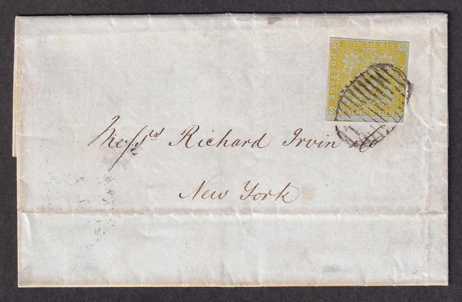 75 CVR 2a image1857 (July 11), 6d orange yellow Heraldic, three ample to large margins, tied to folded letter from St. John to New York by well-struck "1" oval grid cancel, reverse with St. John double split-ring despatch, some light wrinkling and filing folds, but an uncommon franking, fine. (Image 1) (Image 2) (Image 3)