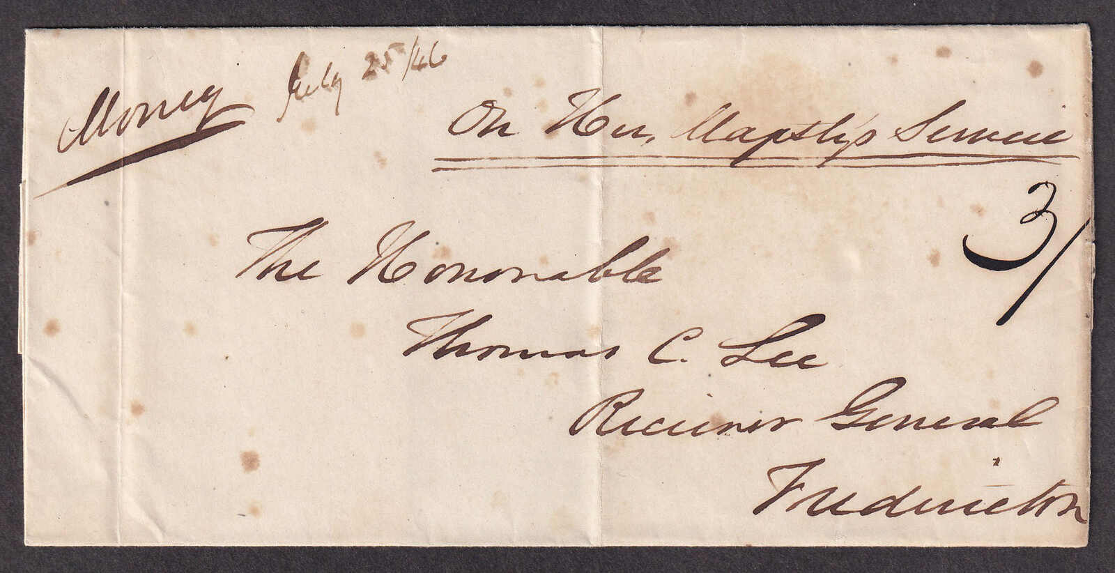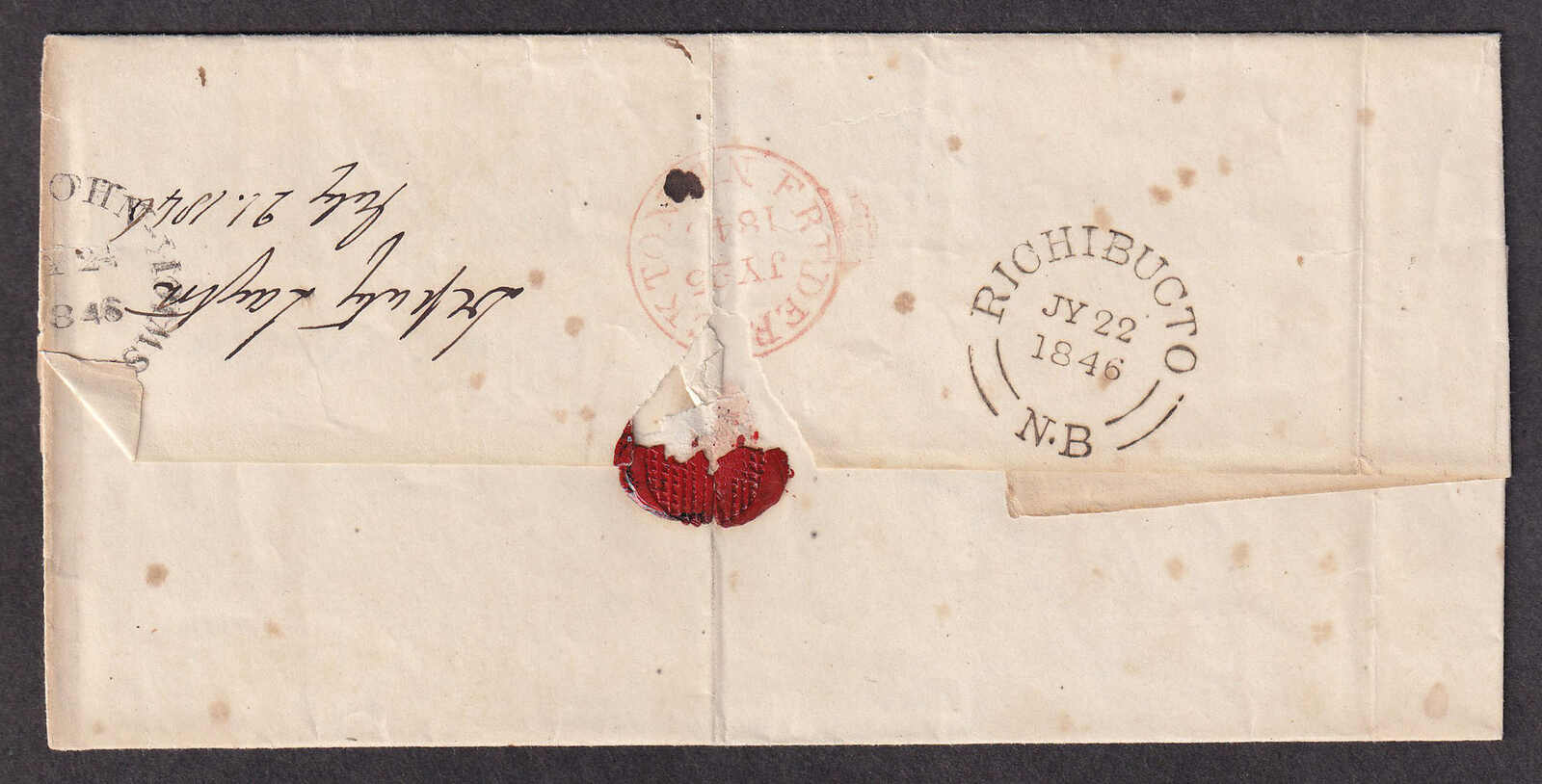 74 CVR   image1846 (July 22), Richibucto to Fredericton, stampless money letter, without contents, endorsed "Money" and "On Her Majesty's Service" in manuscript and rated "3/-" in black, struck on reverse with choice Richibucto double split-ring despatch, with partial St. John (24 Jul) transit and red Fredericton next-day arrival c.d.s., some tone spots, but scarce. (Image 1) (Image 2)