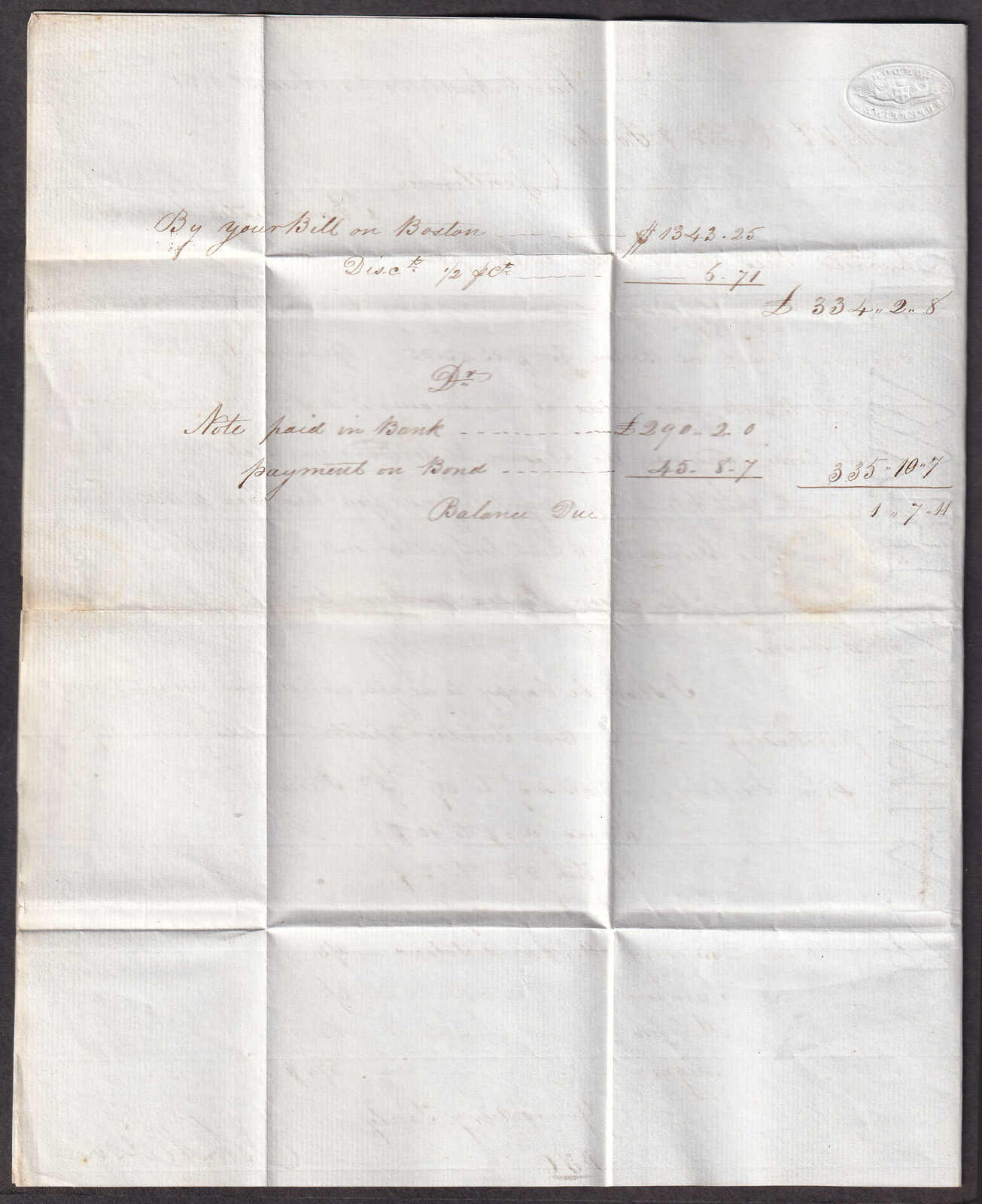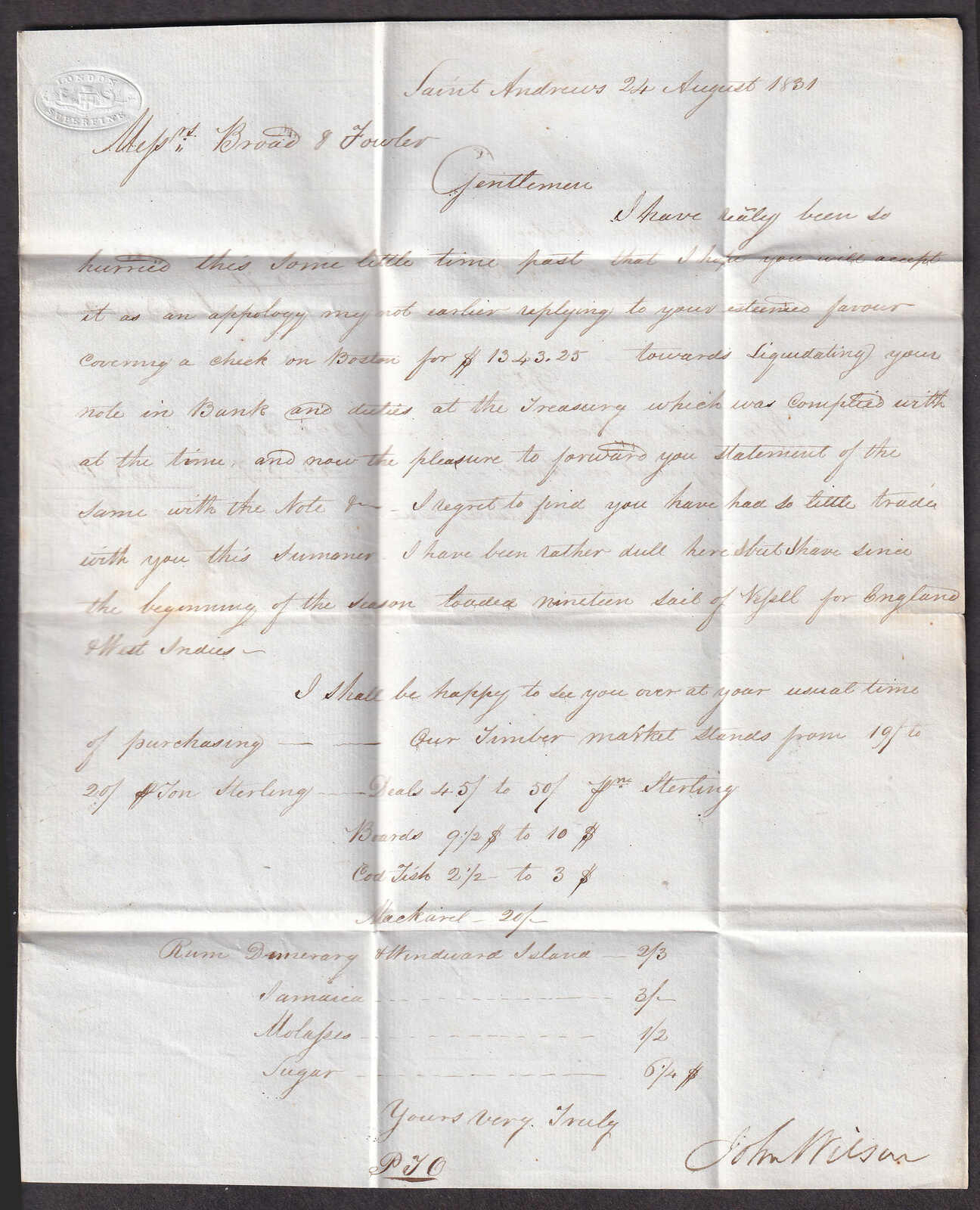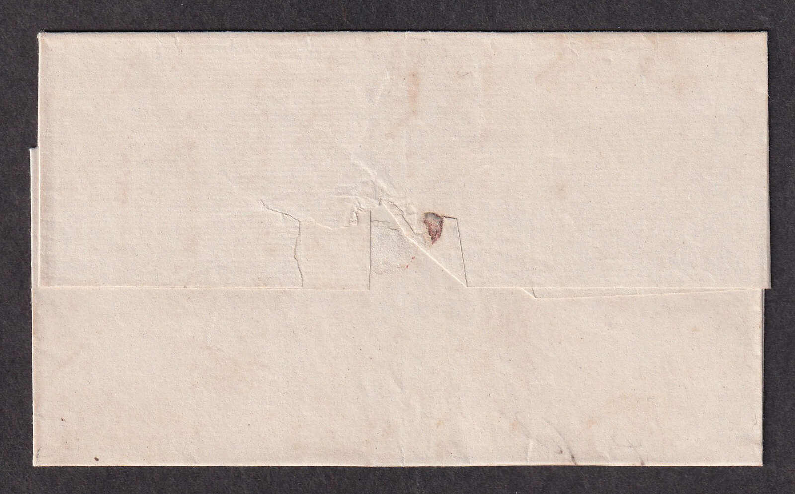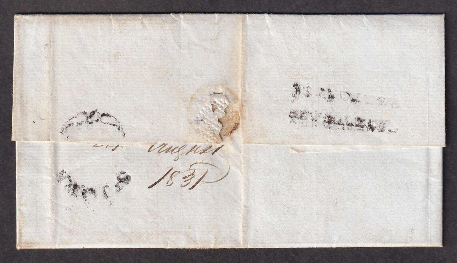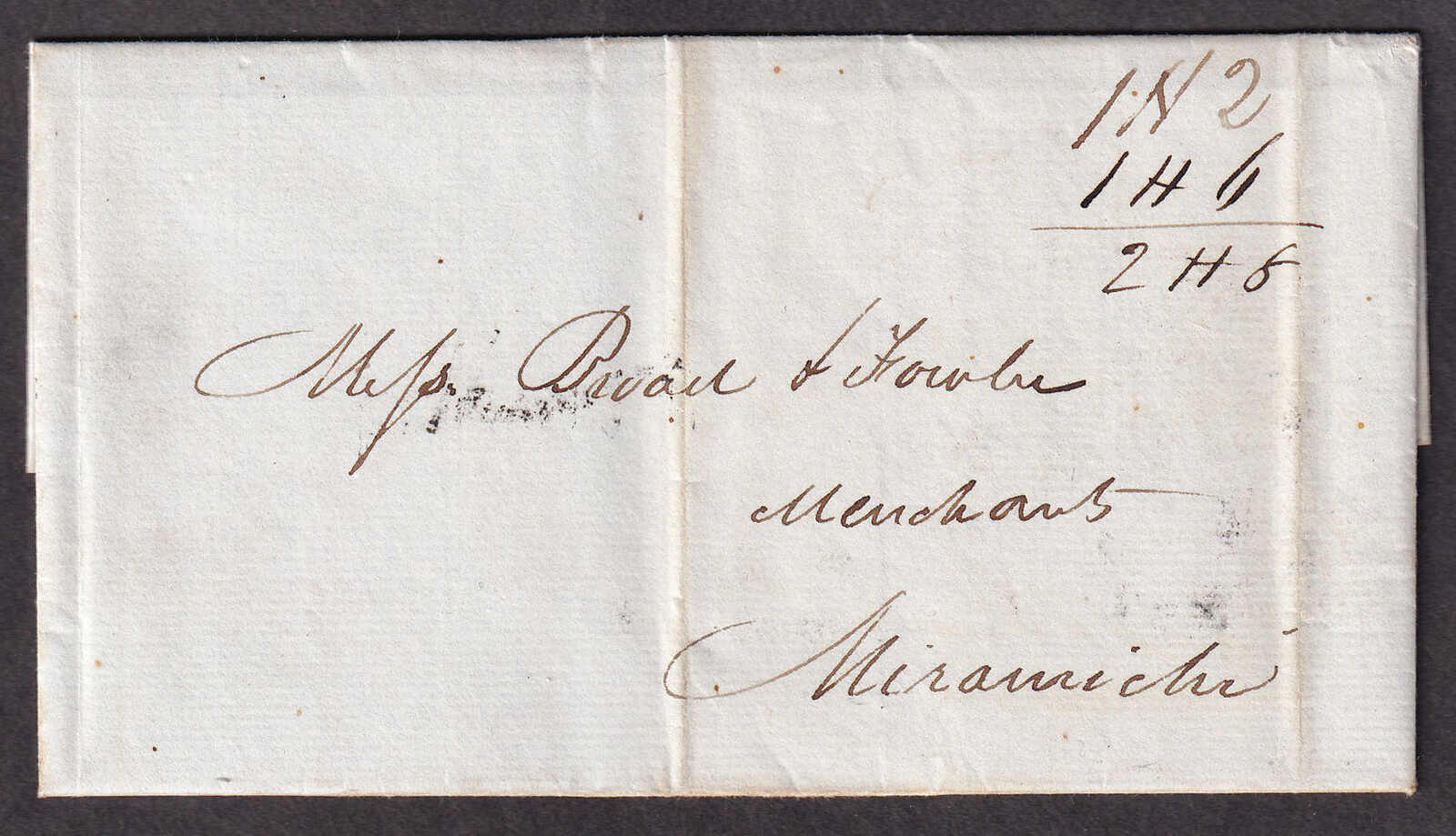 73 CVR   image1831 (August 24), St. Andrews to Mirimachi, stampless folded letter, with contents, rated 1N2 and 1N6 for a total of 2N8, struck on reverse with St. Andrews two-line straight-line and St. John fleuron, filing folds, else fine, an interesting example, demonstrating the practice of mail being rated and every post office en route when not carried via sealed bag. (Image 1) (Image 2) (Image 3) (Image 4)