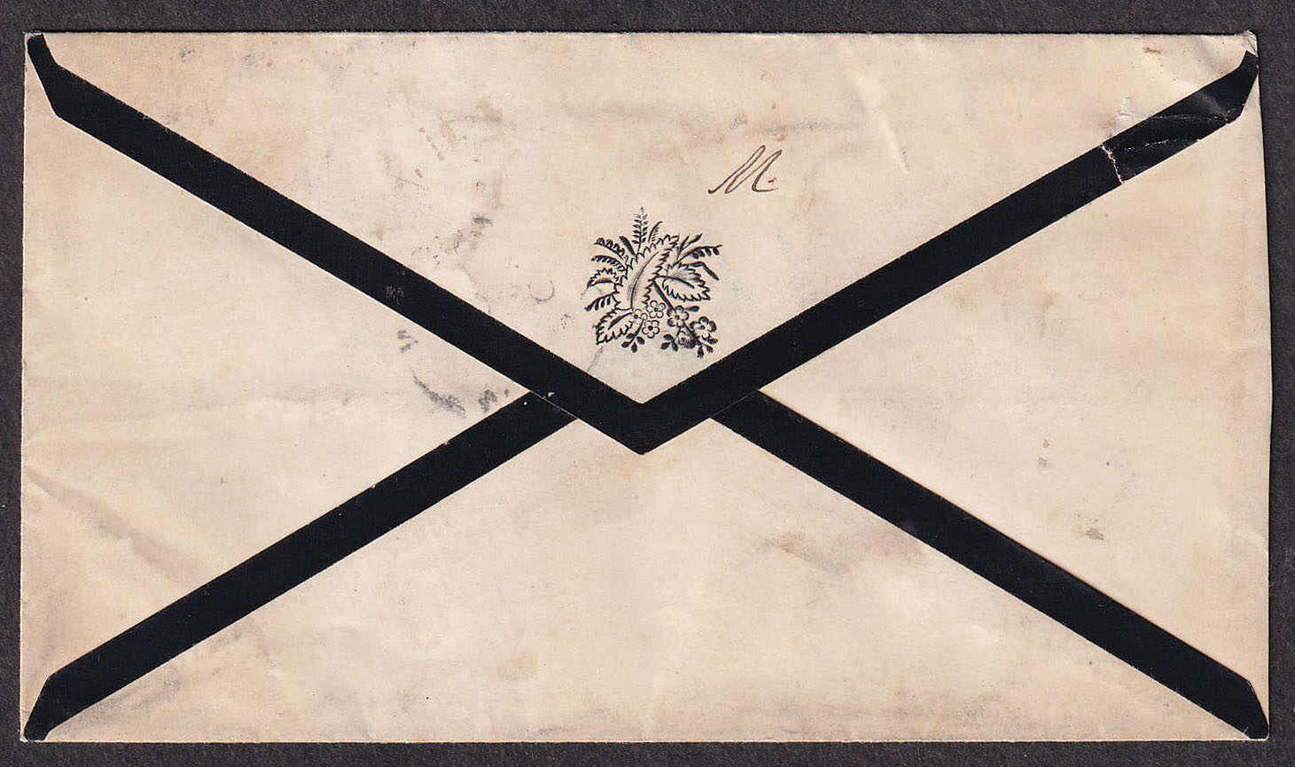 76 CVR   image1874 (June 28), Way Office Jacksonville to Maine, mourning cover franked with 6c Small Queen, tied by black obliterator and postmarked "W.O. Jacksonville" alongside, with date in manuscript, floral imprint on back flap, stamp with some toning, an elusive Carleton County Way Office. (Image 1) (Image 2)