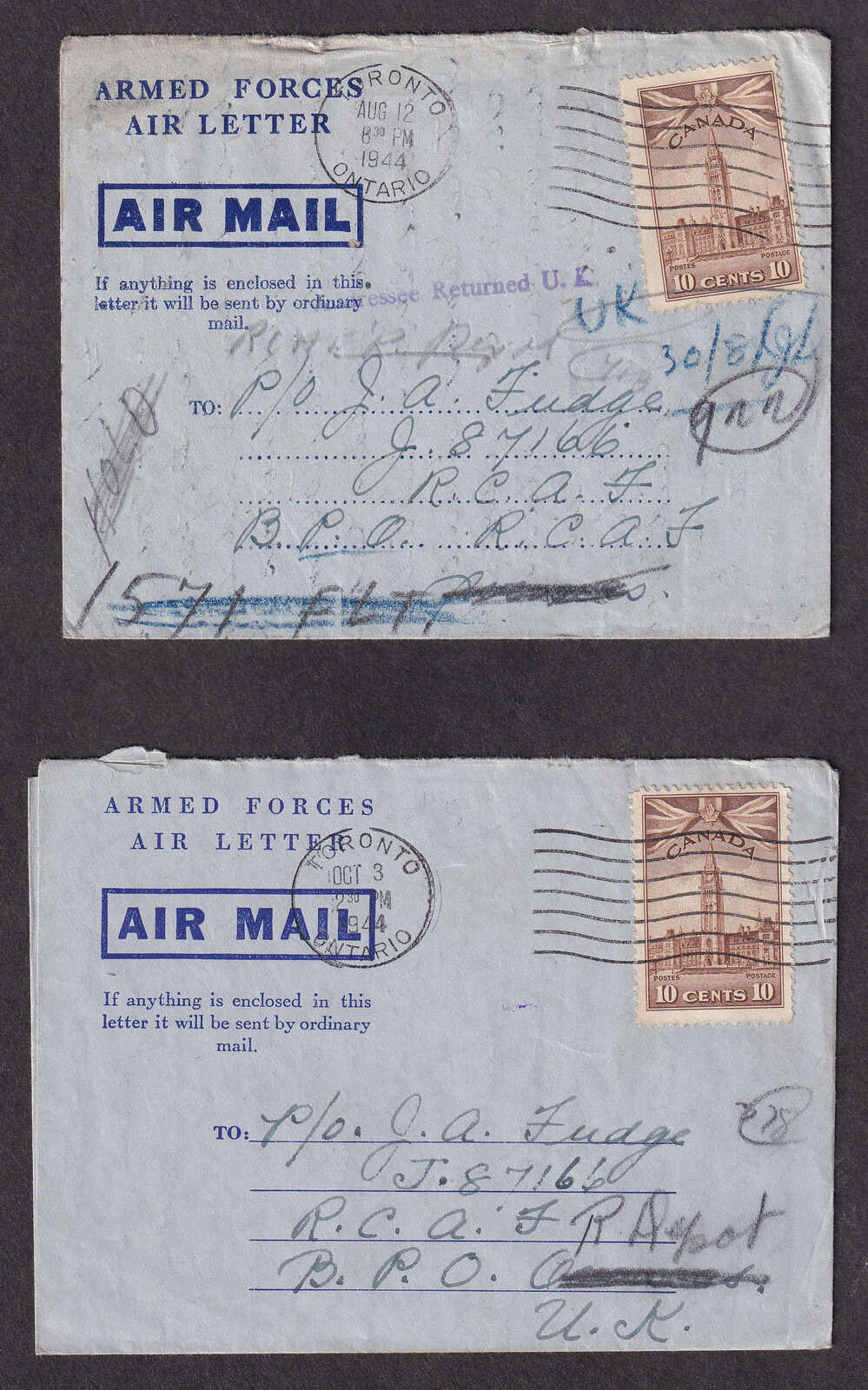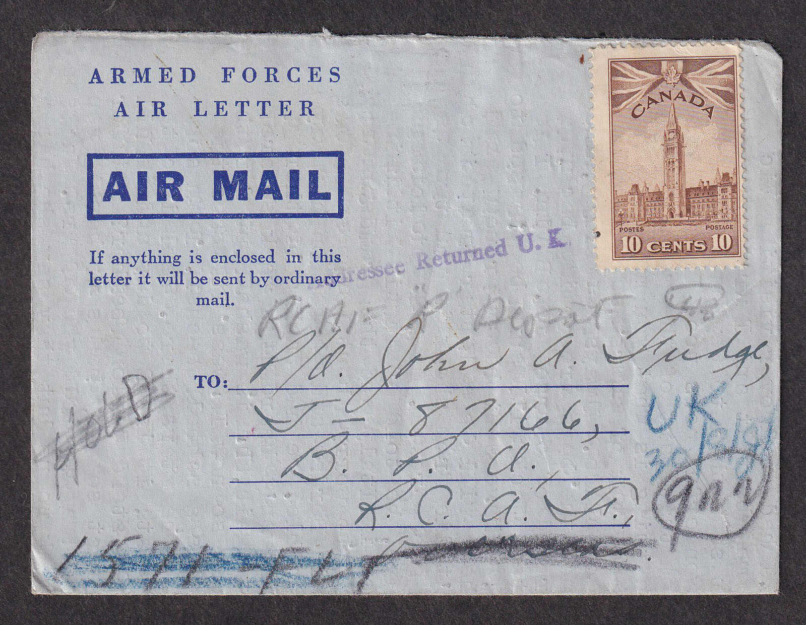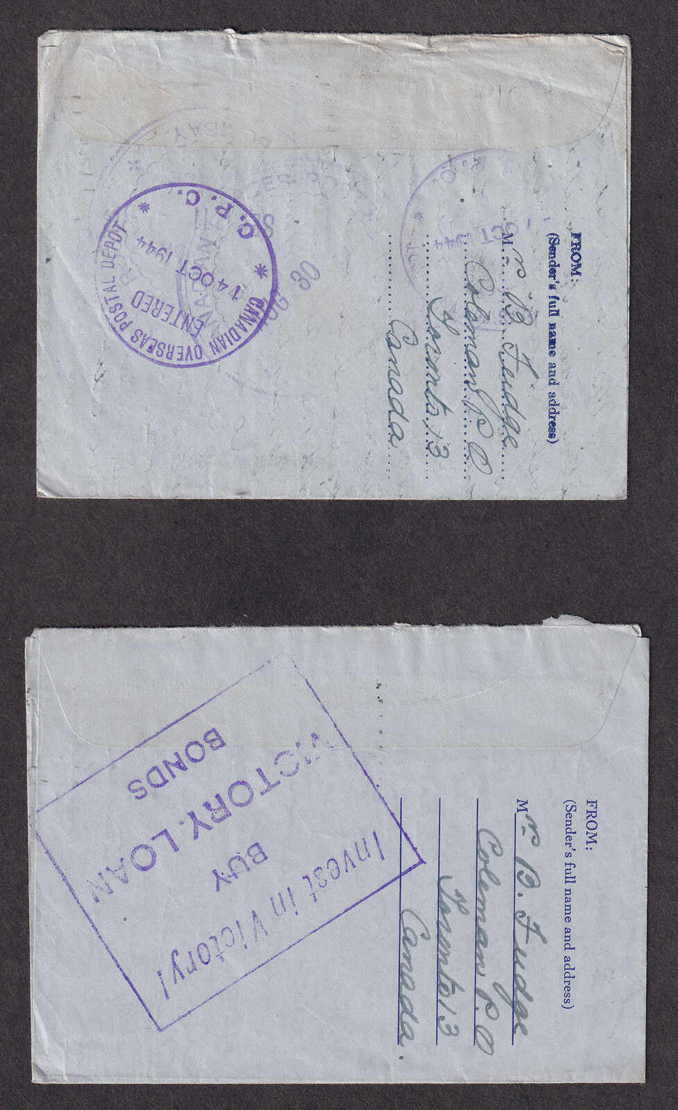 70 CVR   image1944 (August/October), trio of RCAF Air Letters with India interest, all three to P/O J.A. Fudge via BPO RCAF, United Kingdom, each redirected, all to "R Depot", with various manuscript endorsements, two handstamped with violet "Addressee Returned U.K." , these also backstamped CANADIAN OVERSEAS POSTAL DEPOT / ENTERED / CPC and CANADIAN FORCES POSTS / BOMBAY postal tracing handstamp, one with bold framed "Invest in Victory! BUY / VICTORY LOAN / BONDS" backstamp, some typical wrinkles, else a fine and uncommon group, with Canadian military postal material related to India being rather elusive. (Image 1) (Image 2) (Image 3) (Image 4)