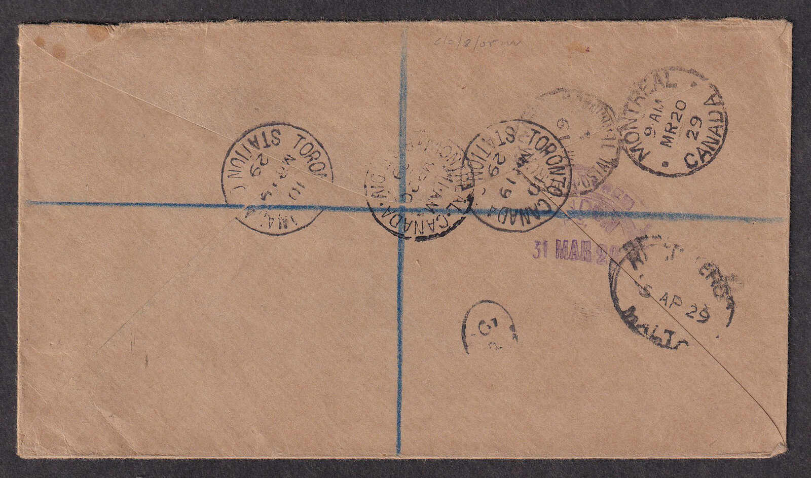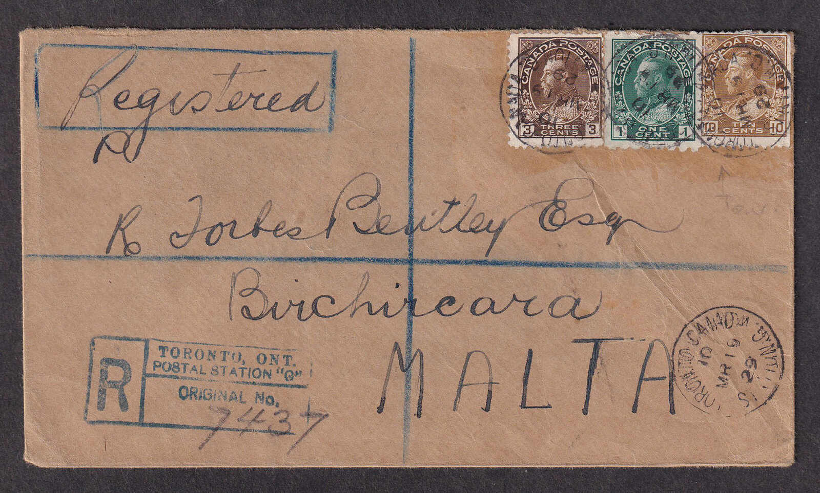 61 CVR   image1929 (March 19), double-UPU registered letter rate Admiral cover to Malta, franked with 1c dark green coil, 3c brown, and 10c bistre, all tied by Toronto Station G c.d.s., to Birchircara (Birkirkara), with multiple Toronto backstamps, Montreal transit (20 Mar) and Registered / Malta oval (5 Apr), a scarce rate to an uncommon destination. (Image 1) (Image 2)
