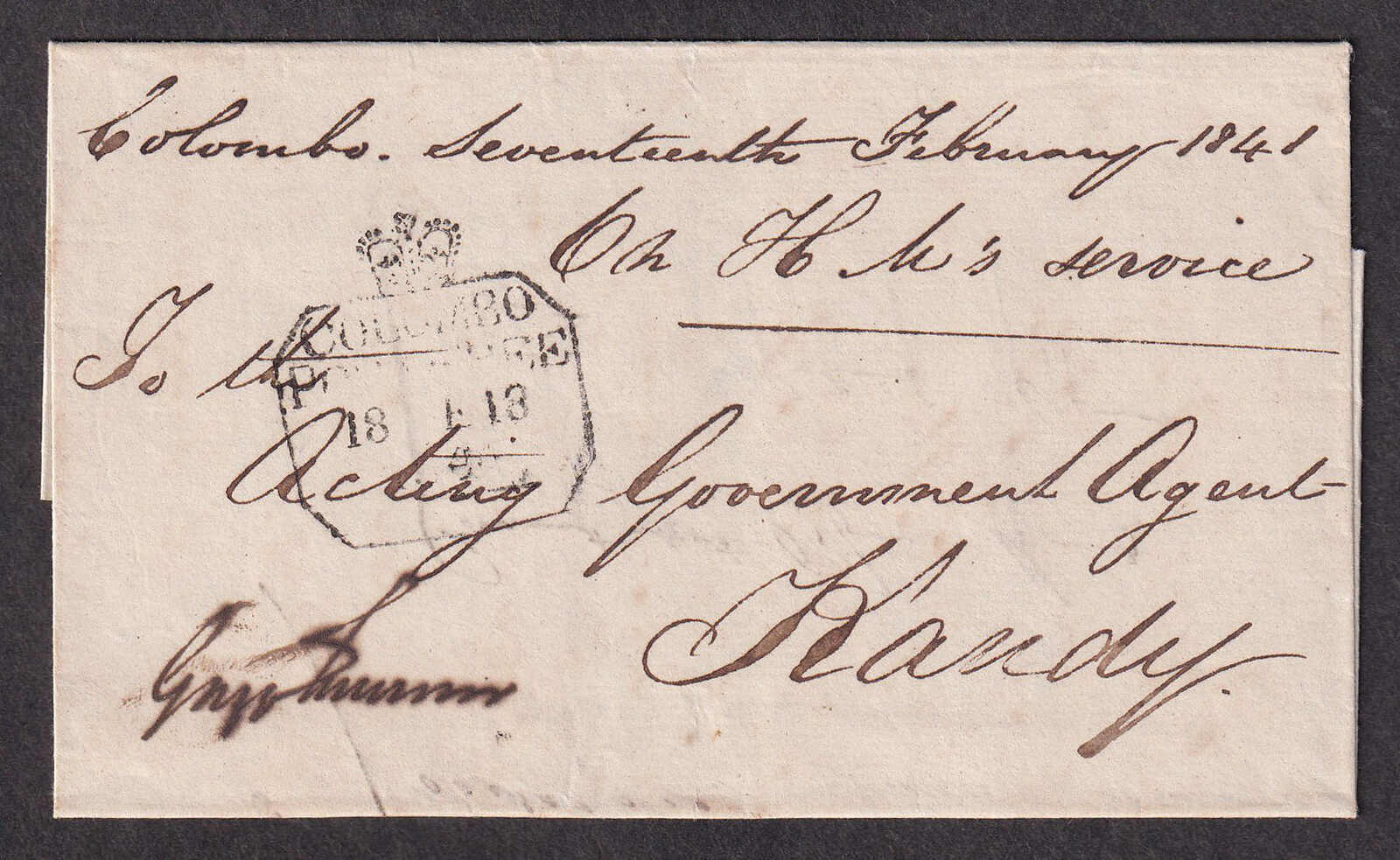 78 CVR   image1841 (February 17), "Colombo Post Free" stampless folded cover to Kandy, endorsed "On HM's Service", struck with fair Crowned COLOMBO POST FREE (Proud OPD8) datestamp, to the Acting Government Agent in Kandy, no backstamps, remarkably fresh and fine. (Image 1) (Image 2)