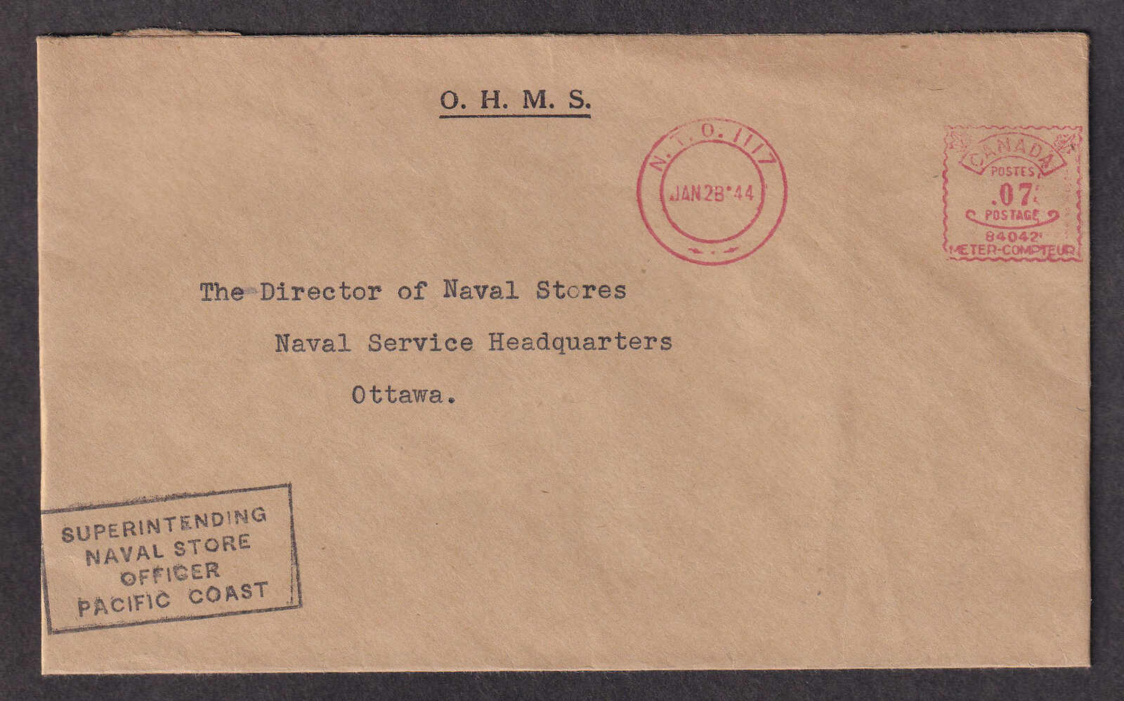69 CVR   image1944 (January 28), "N.T.O. 1117" naval meter error, on O.H.M.S. cover from Vancouver to Ottawa, struck with framed "Superintending / Naval Store / Officer / Pacific Coast" handstamp, the meter showing "N.T.O." rather than "N.P.O.", the cover folded on two sides for display, not impacing the meter, else a very fine Second World War meter error. (Image 1) (Image 2)