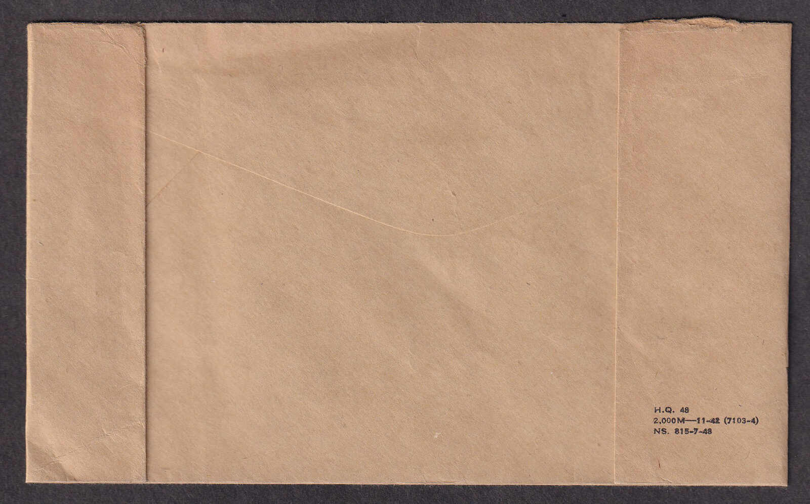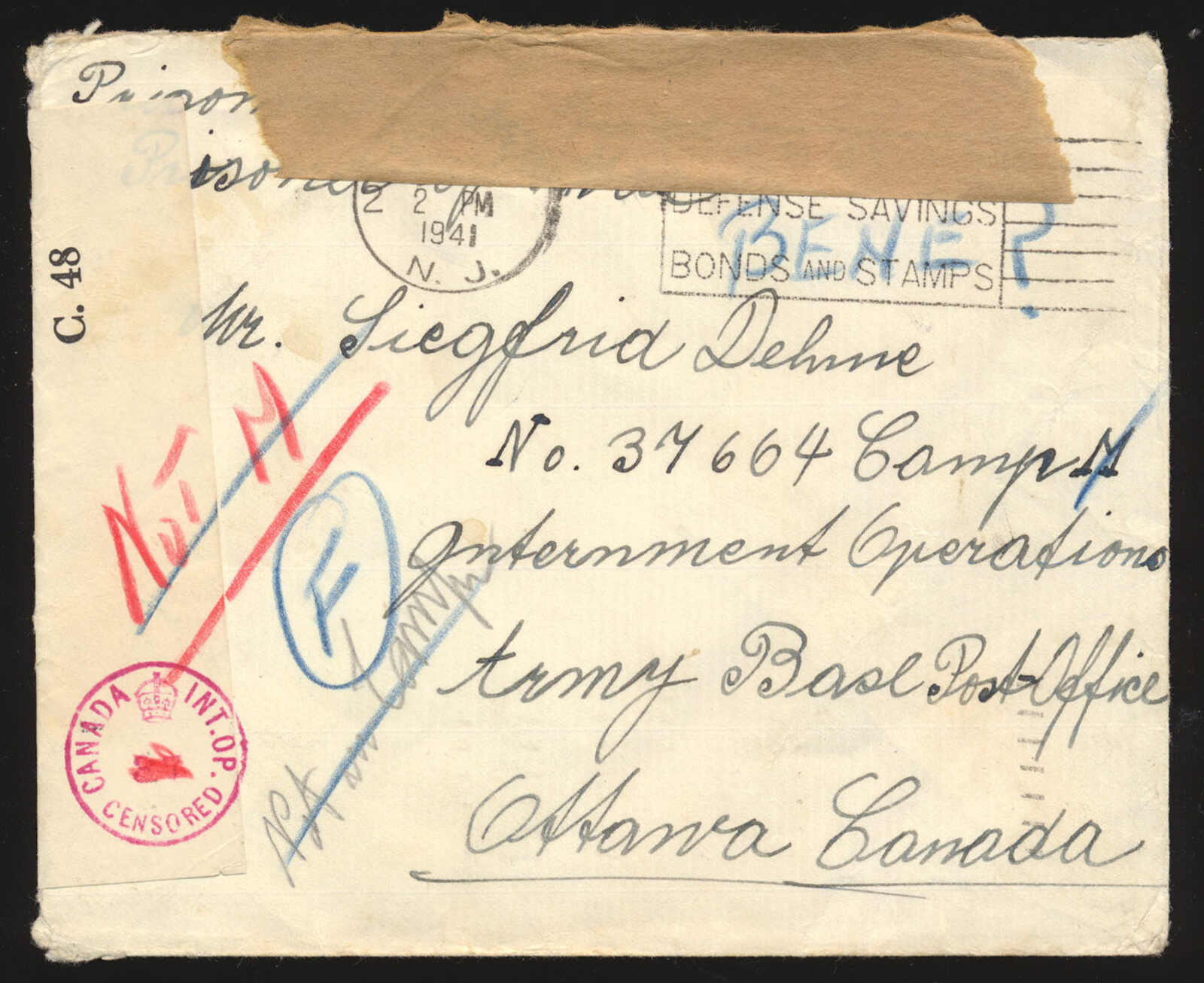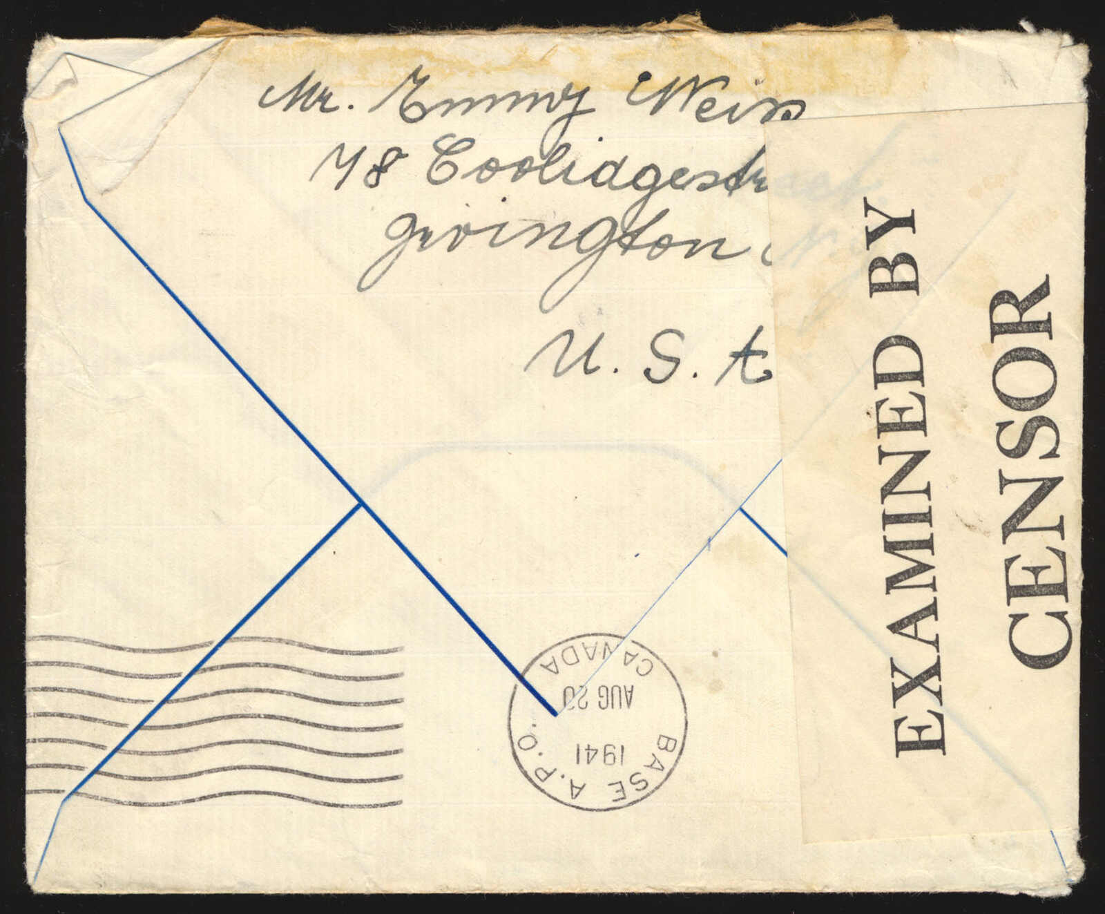 65 CVR   image1941 (August), incoming cover to Internment Camp M, Mimico, forwarded to Fort Henry, postmarked in Newark, New Jersey, to a civil internee in Mimico, Ontario, endorsed "NOT M" and "Not in Camp" in manuscript, "F" notation in crayon denoting forwarding to the camp at Fort Henry, Kingston, Ontario, reverse with Base A.P.O. machine cancel (20 Aug), sealed along top and further along left by Canadian censor C.48 tied by rose CANADA INT OP / CENSORED handstamp, the "37" in centre crossed-out, a superior quality cover for prisoner of war mail. (Image 1) (Image 2)