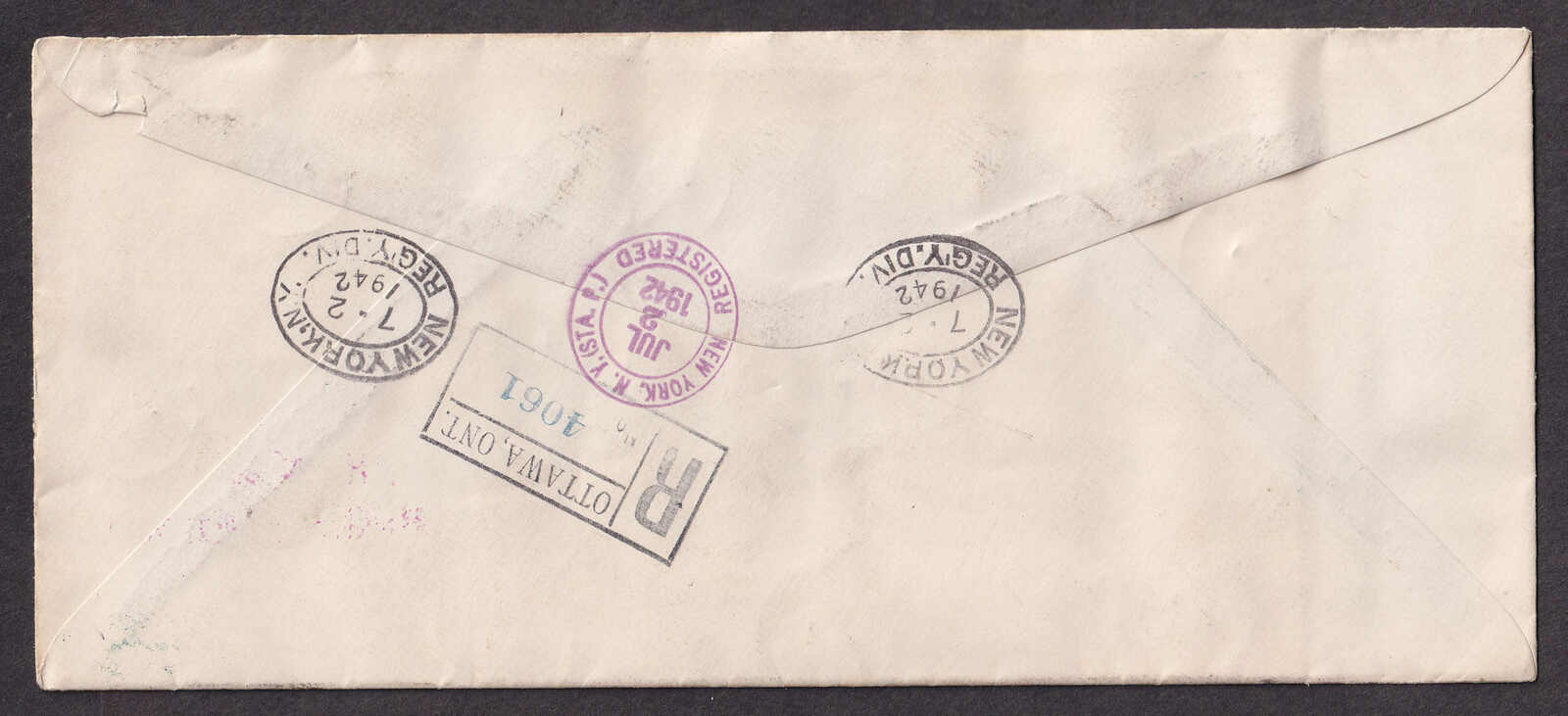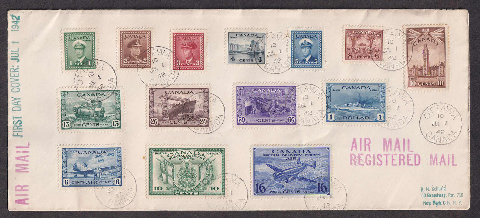 67 CVR 249-262, C7, CE1, E10 image1942 (July 1), 1c to $1 War Issue registered First Day Cover, including 6c Air Mail, 16c Special Delivery Air Mail, and 10c Special Delivery, each cancelled by Ottawa c.d.s., reverse with Ottawa registration handstamp and New York arrival backstamps, some light edge creasing, but an uncommon franking including the back-of-the-book issues (Image 1) (Image 2)