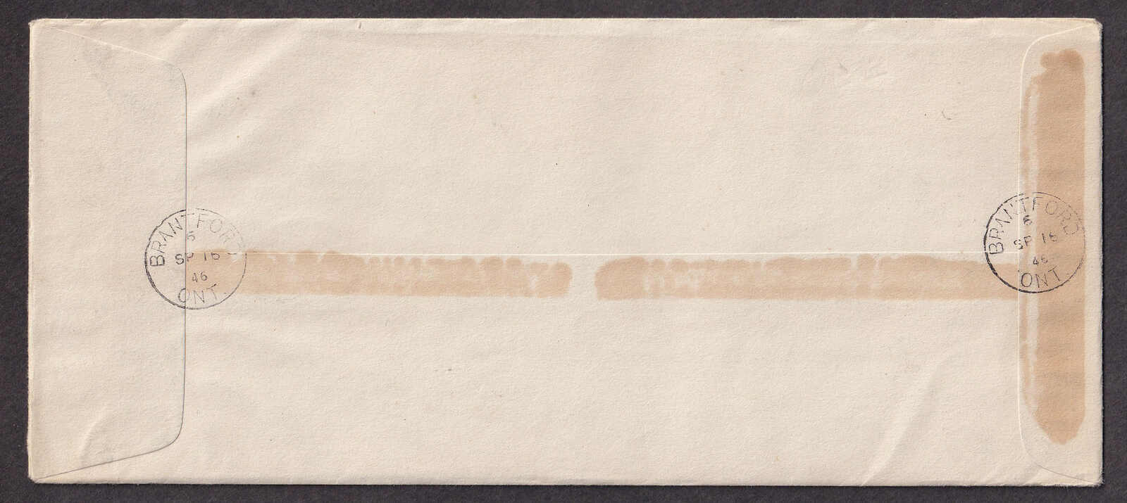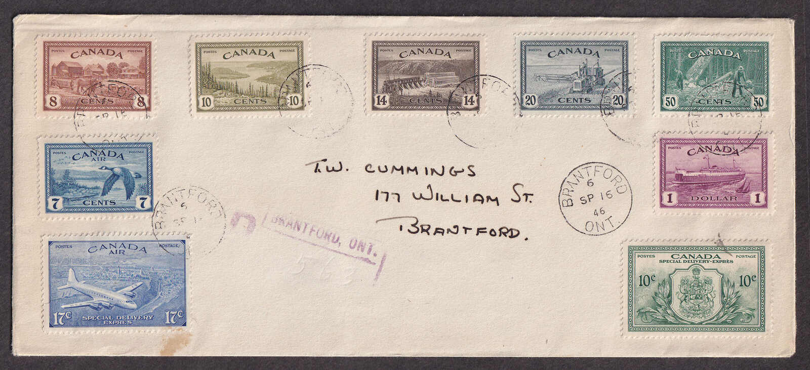 72 CVR 268-273, C9, CE3, E11 image1946 (September 16), 8c to $1 registered First Day Cover, including 7c Air Mail, 17c Special Delivery Air Mail, and 10c Special Delivery, each cancelled by Brantford c.d.s., sent locally, with same-day c.d.s. backstamps, some light corner bumps, a desirable FDC with both regular and back-of-the-book issues. (Image 1) (Image 2)