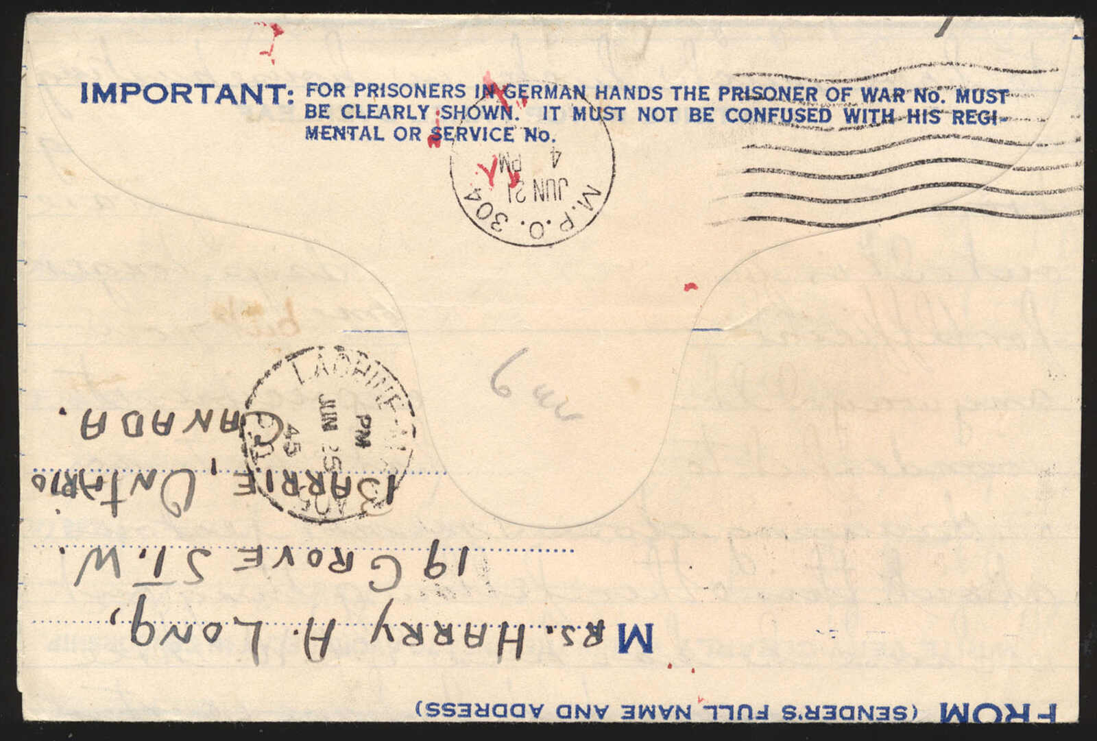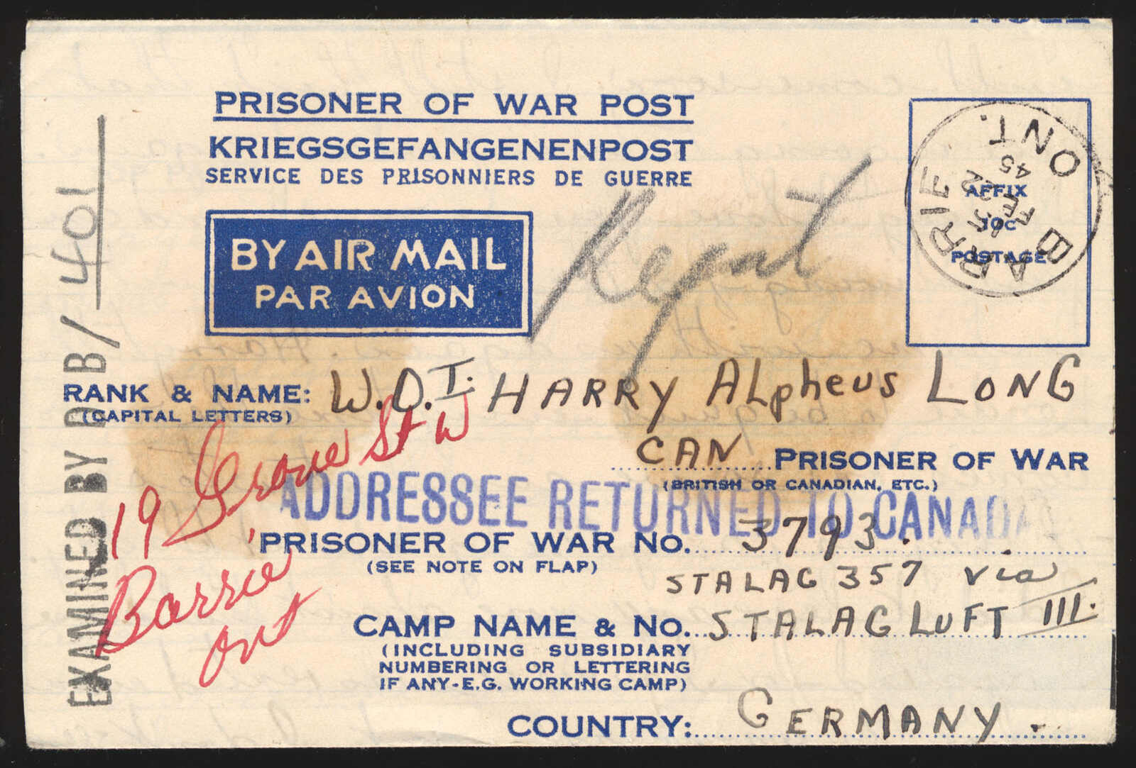 71 CVR   image1945 (February 22), Prisoner of War returned to Canada, letter sheet postmarked Barrie, to W.O.T. Harry Alpheus Long, POW at Stalag Luft III, Germany, manuscript "Repat" (repatriated) and struck with blue straight-line ADDRESSEE RETURNED TO CANADA, returned to Barrie, with MPO 304 and Lachine MPO transit backstamps, two central grase stains, else a desirable item to a freed prisoner of war. (Image 1) (Image 2)