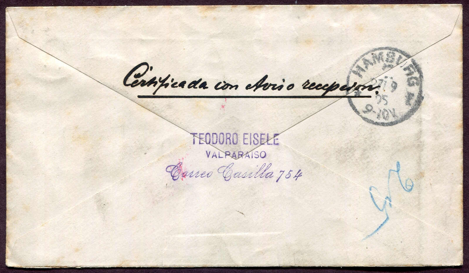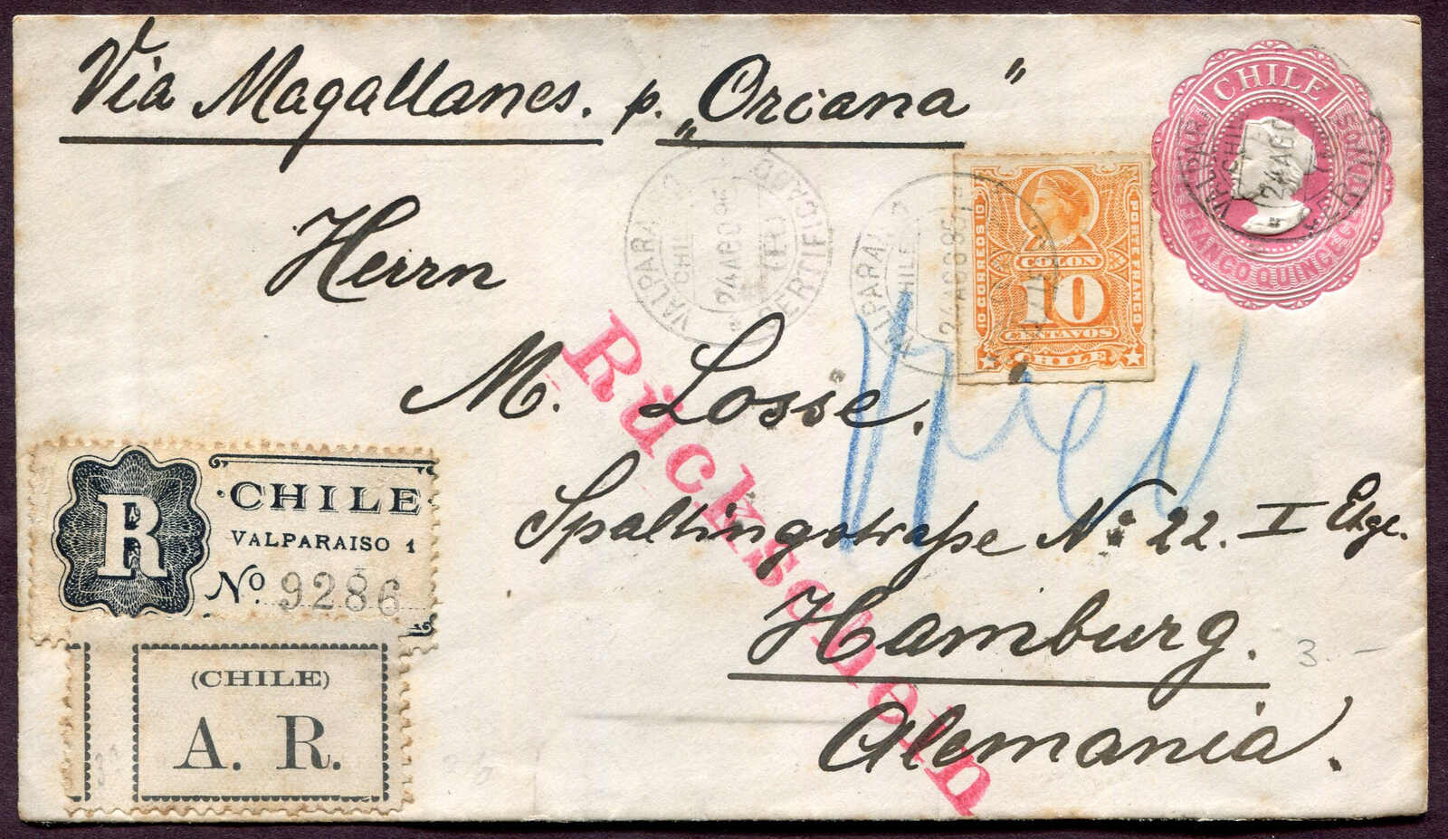 80 CVR   image1895 (24 August), uprated registered A.R. postal stationery cover, from Valparaiso to Hamburg, Germany, postmarked with neatly-struck double-circle Valparaiso c.d.s., tying 10c. Columbus, registration and A.R. labels affixed at left, endorsed in manuscript "via Magallanes p. 'Oriana'" on front and "Certificada von Avio recepcion" on reverse, alongside Hamburg arrival backstamp (27 Sep), some edge toning, else fine. (Image 1) (Image 2)