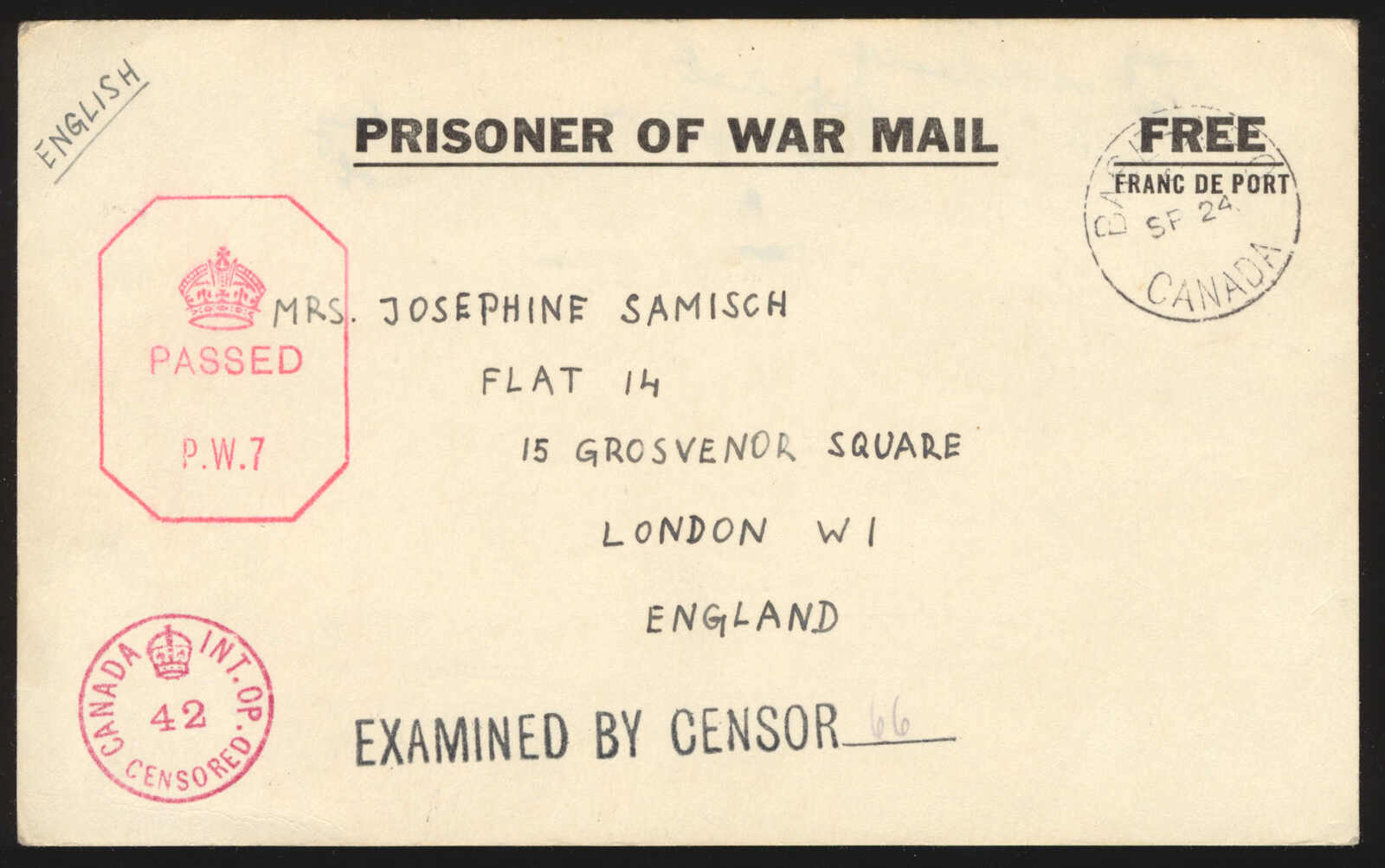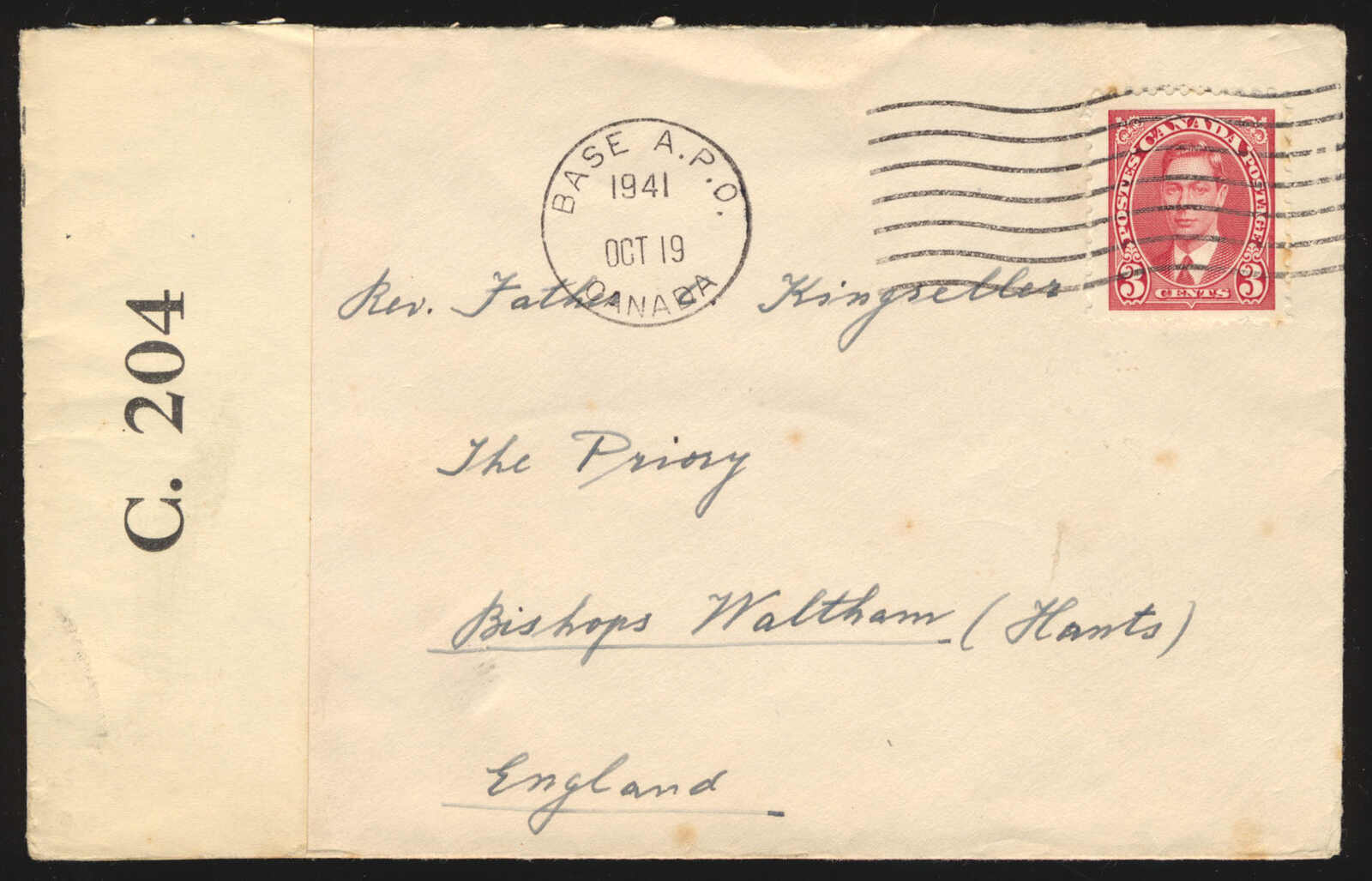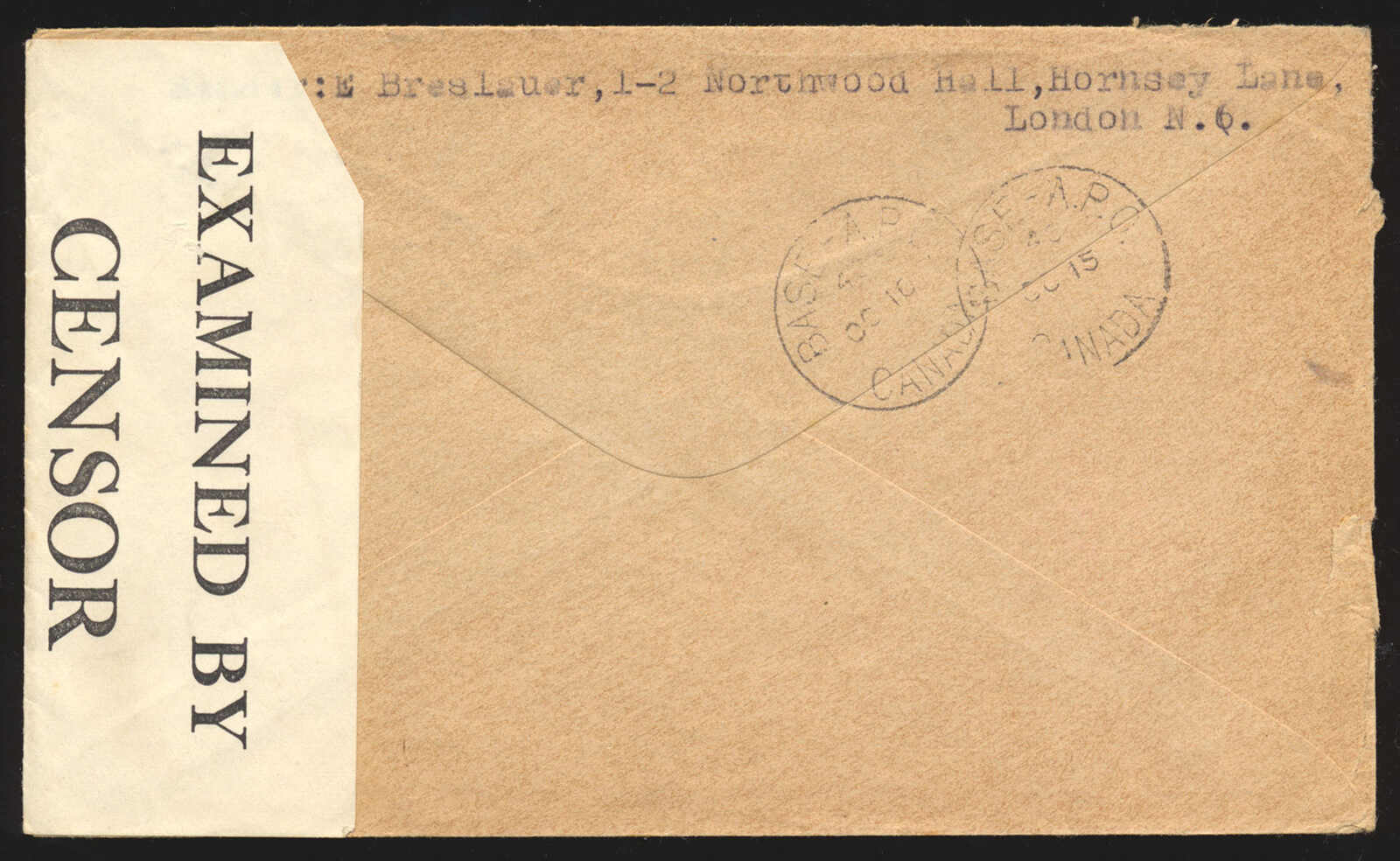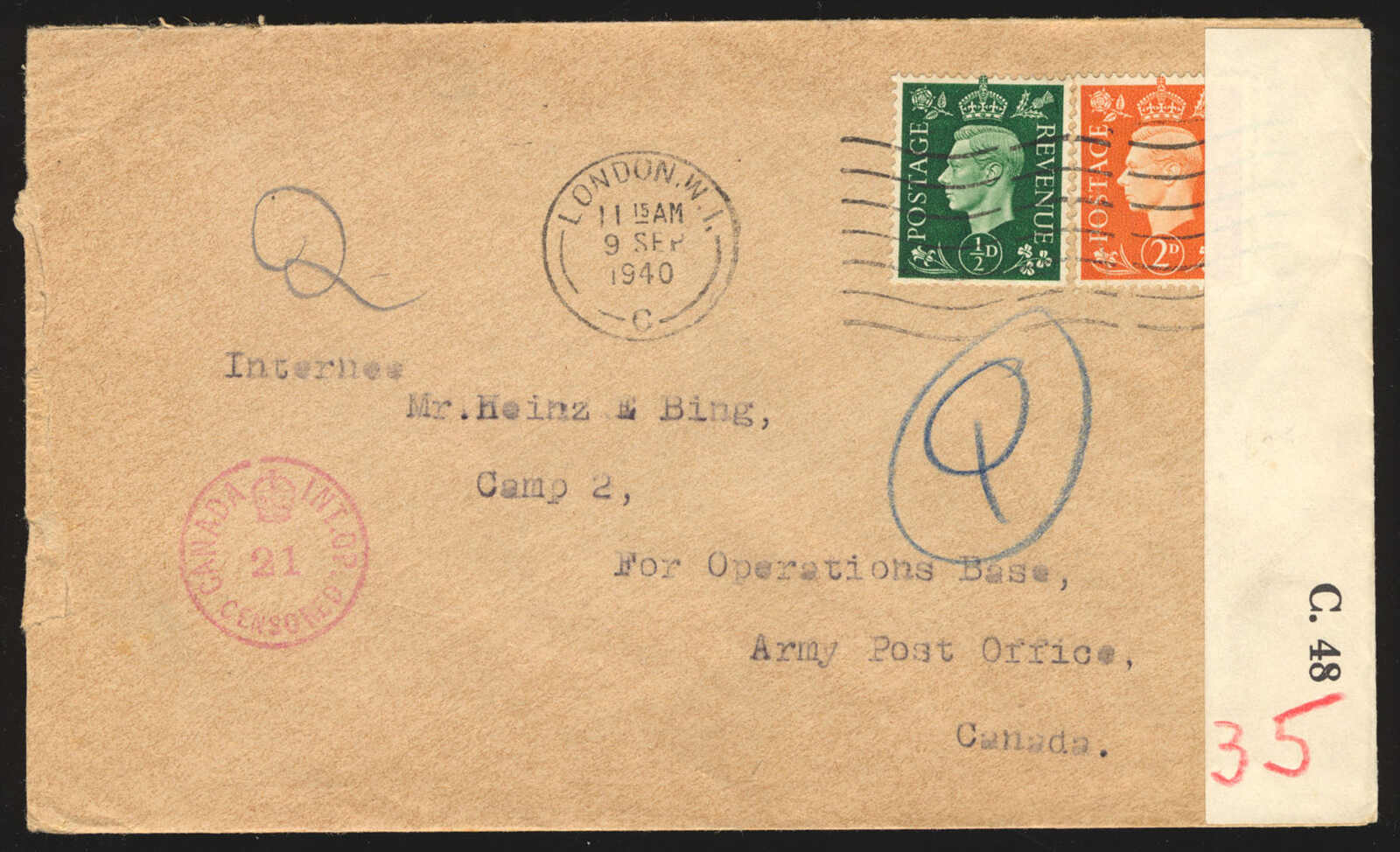 62 CVR   image1940 (September 9), incoming cover to internment camp Q, Monteith, franked with Great Britain ½d and 2d King George VI definitives, postmarked with London machine cancel, with British censor seal at right, and neatly-struck "CANADA INT OP / CENSORED / 21" handstamp in rose, addressed to internee Heinz Bing, Camp 2, "For Operations Base, Army Post Office, Canada", "Q" in blue crayon indicating the camp at Monteith, Ontario, later renumbered Camp 23, reverse with BASE APO transit c.d.s. (15 Oct), very fine; the camp at Monteith opened in July, 1940, only a few months prior to this letter being received. It closed in 1944. (Image 1) (Image 2)