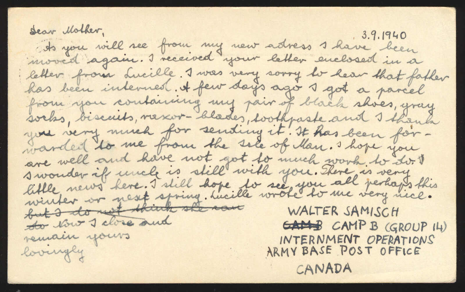 63 CVR   image1940 (September 24), Internment Camp B, Fredericton, prisoner of war postal card, to London, England, struck with Base APO c.d.s., with choice strikes of three censor markings, the sender expressing his regret that his father has been interned, and noting that he'd recently received a parcel with his clothing that had been forwarded from the Isle of Man, the sender thus apparently being one of the many British civil internees who were transferred from the Isle of Man to camps in Canada, superior quality, very fine. (Image 1) (Image 2)