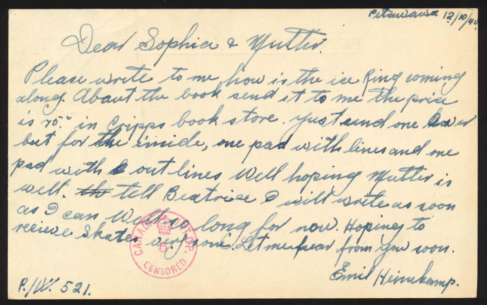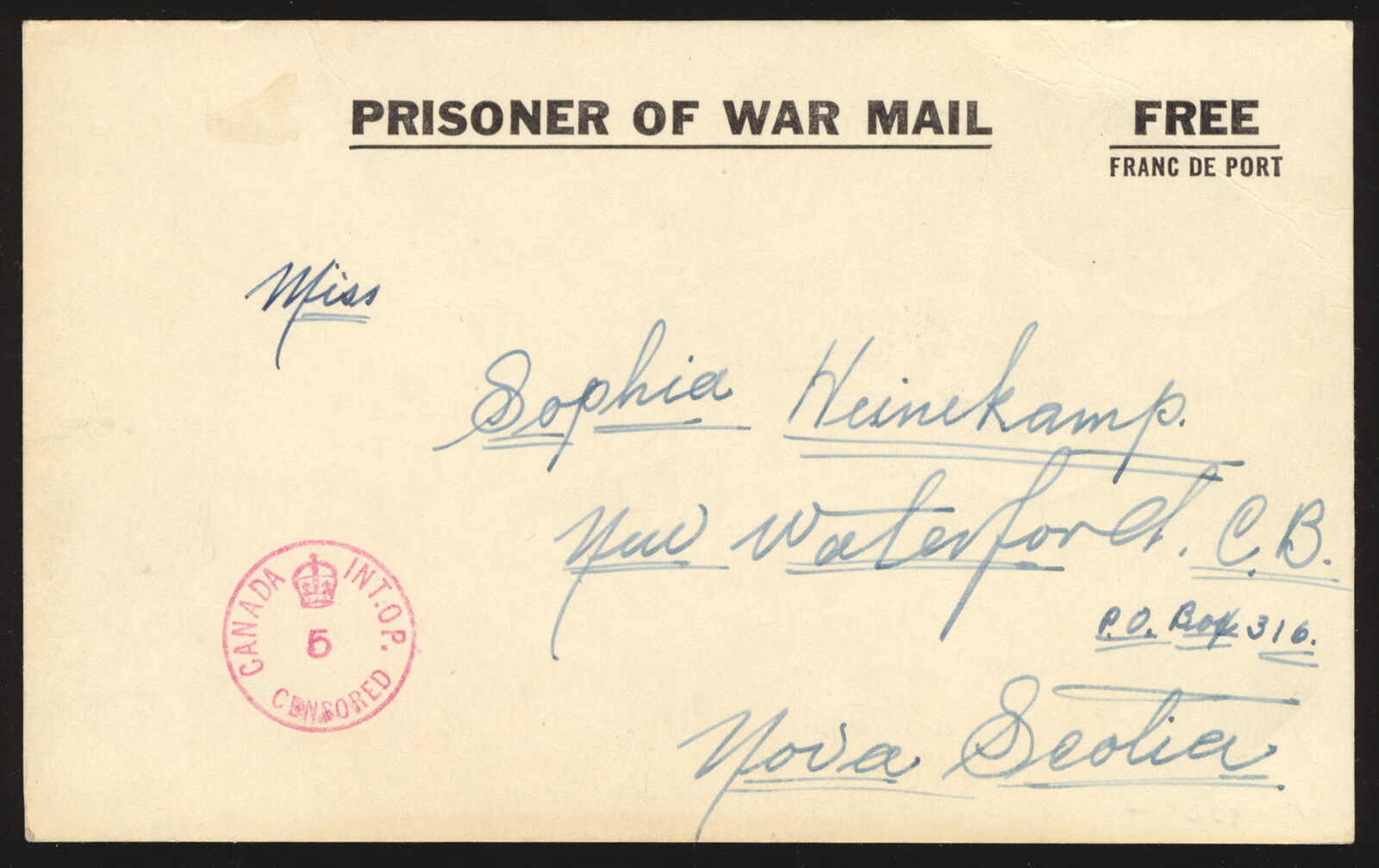 64 CVR   image1940 (December 10), Internment Camp F, Petawawa, prisoner of war postal card, to New Waterford, Cape Breton, struck with crisp "CANADA / INT OP / CENSORED / 5" handstamp, from civilian internee Emil Heinekamp, extremely light vertical crease, else quite fresh and very fine; Petawawa Camp was comprised of barracks-type accomodations, capable of holding up to 8,000 individuals, initially internees of German or Italian origin. (Image 1) (Image 2)