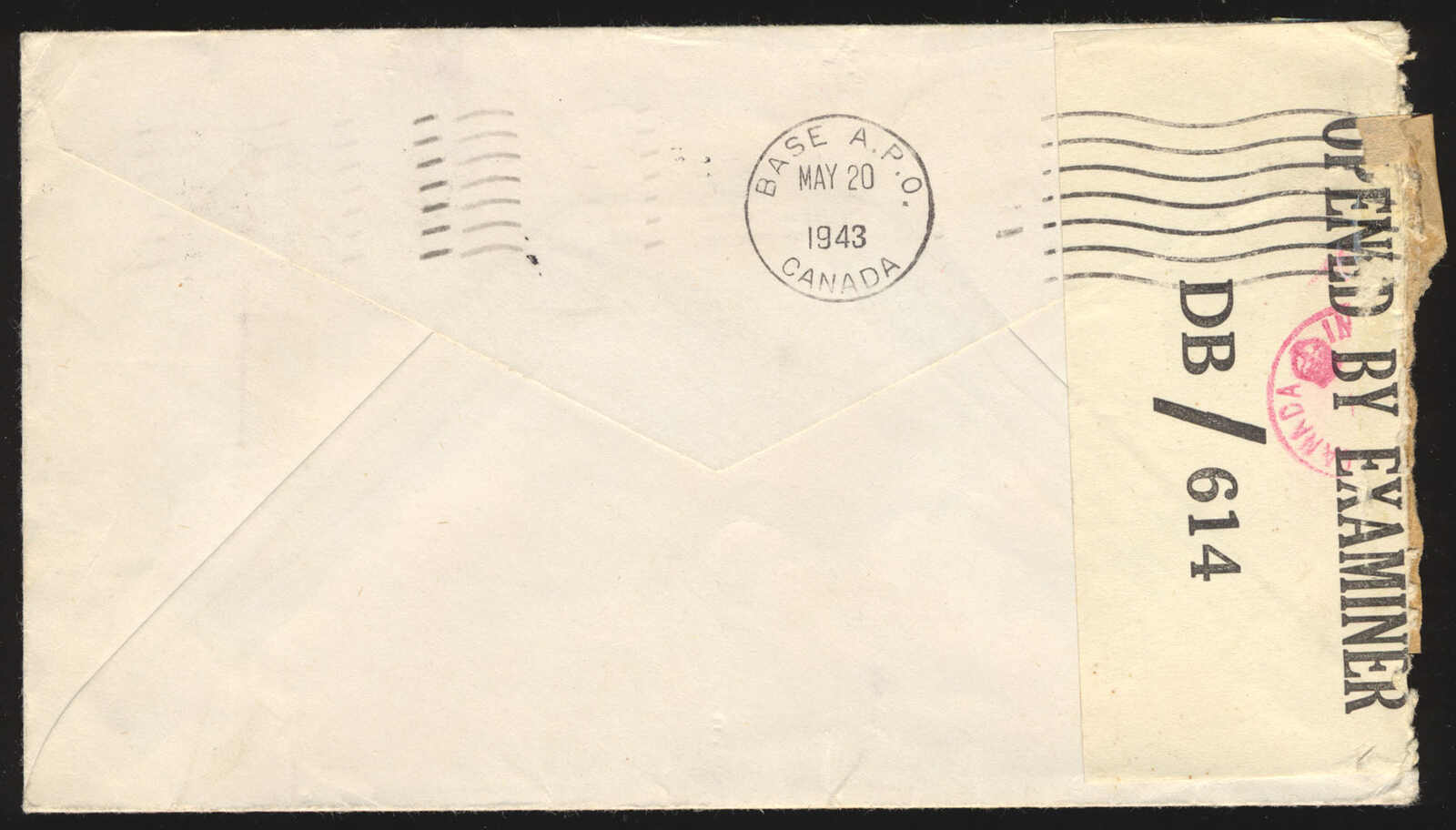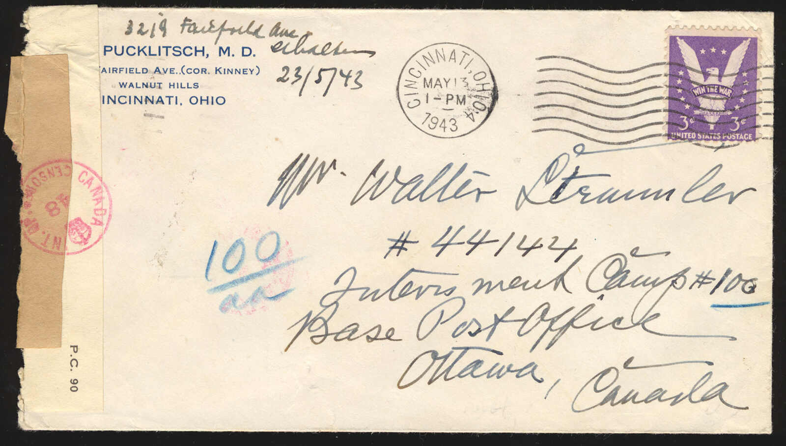 68 CVR   image1943 (May 13), incoming cover to internment Camp 100, Neys, franked with 3c "Win the War", tied by Cincinnati machine cancel, correctly addressed via the Base Post Office in Ottawa, resealed by censor at left, tied by "CANADA INT OP / CENSORED / 48" handstamp, reverse with BASE APO machine transit (20 May), fresh and very fine; Camp Neys could hope 650 prisonners in barracks-style housing, including accomodations for officers, other ranks, internees, and enemy merchant seamen. (Image 1) (Image 2)