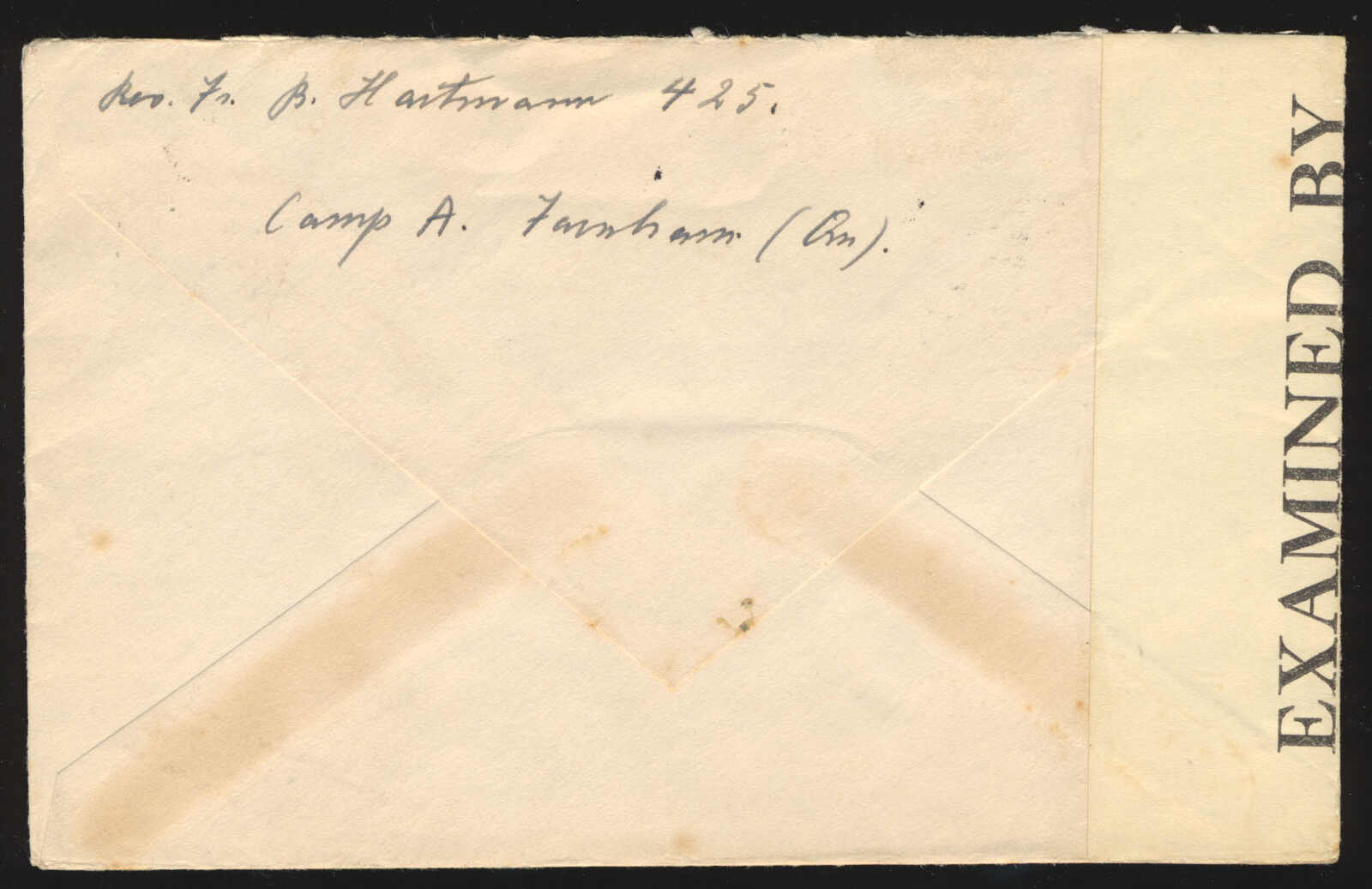 66 CVR   image1941 (October 19), Camp A, Farnham, re-classified refugee mail, cover franked with 3c Mufti, tied by Base A.P.O. machine cancel, to Bishops Waltham, England, sealed by censor at left, no backstamps, a very fine and unusual cover from an internee, re-classified as a refugee, who then lost the privilege of free postage. (Image 1) (Image 2)