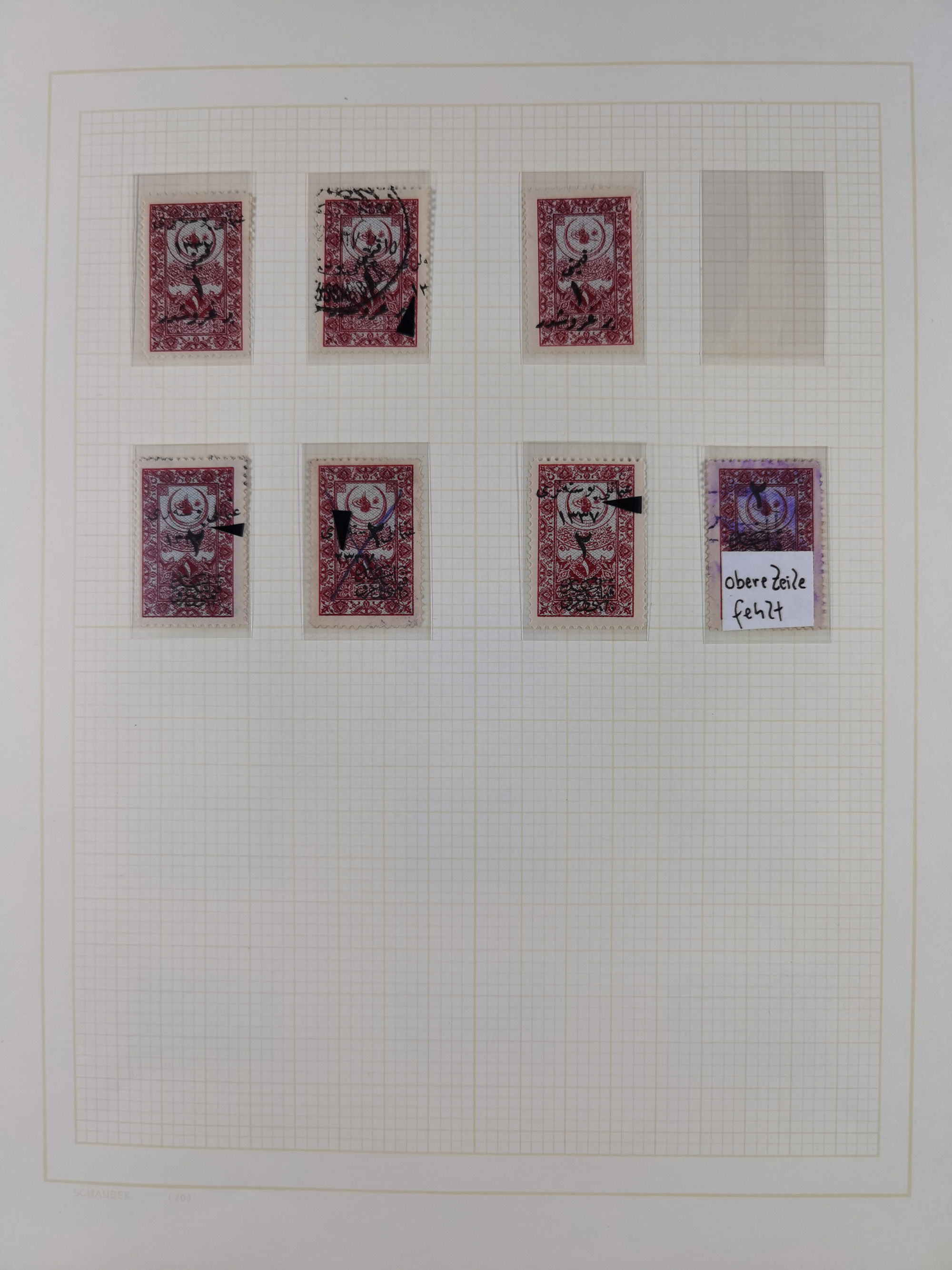 1917, OX-HEAD (PTT) Issues specialized collection on 24 selfmade album pages including a mainly used set, many high values 25 pia. on piece, some blocks und multiples, 19 covers with pure PTT-Frankings, some of them registered to Germany, a collection that is difficult to assemble in such richness.