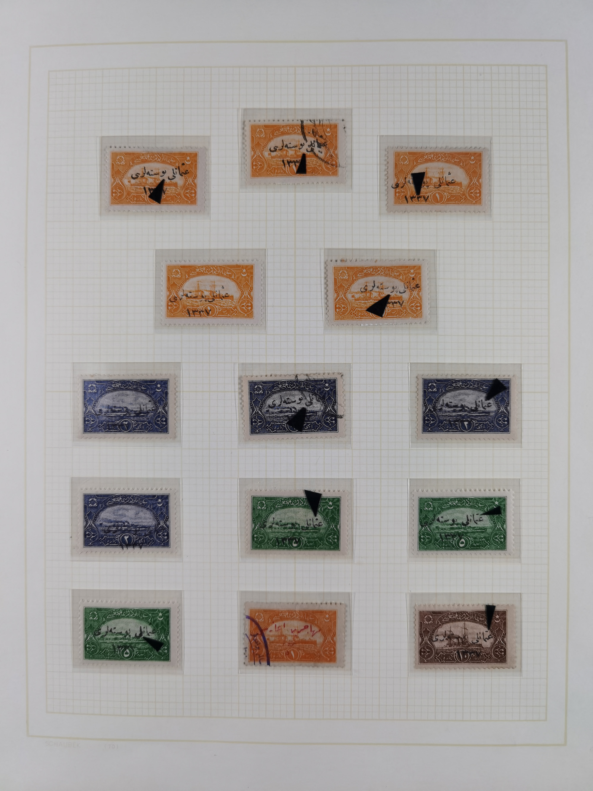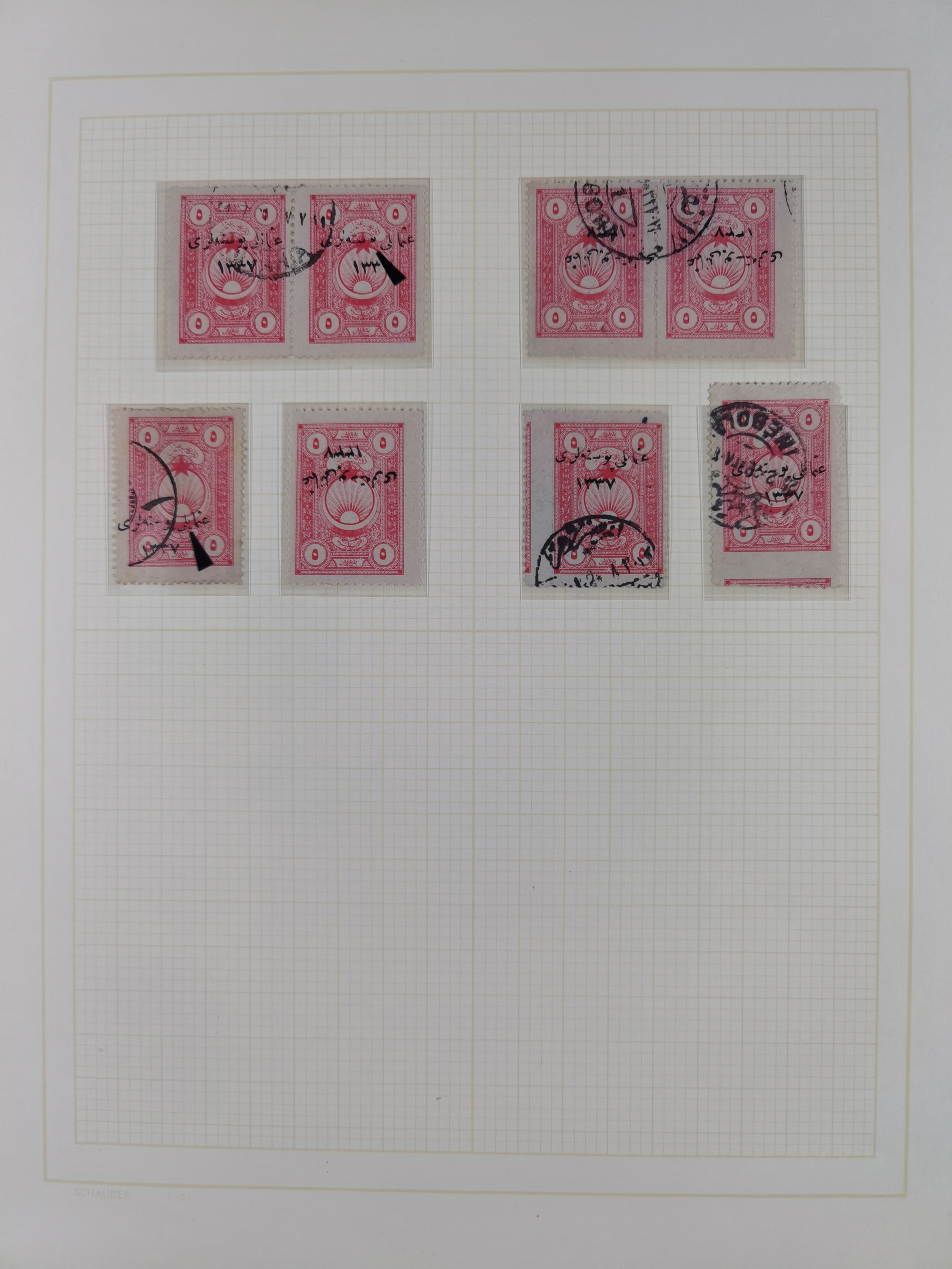 1865/1980 (ca.), Collection of mostly excellent copies of the "Duloz” issues with nice and clear cancellations in a very lovingly designed album, 1 pia. yellow 1871 corner margin block of 15, ‘Arabkir’ on 1875 block of nine, ship cancels ‘Vapur’ and numeral railway marks, 1, 2, 3 and 6 of Smyrna Aidin railway. Lost territories with clear cancellations of Irak, Bulgaria, Greece with islands, Lebanon & Palestine, Albania and Yugoslawia, nice pieces and multiples, neatly in two albums, plus 22 Duloz envelopes. Coles & Walker handbooks Part 1, 2 and 4.