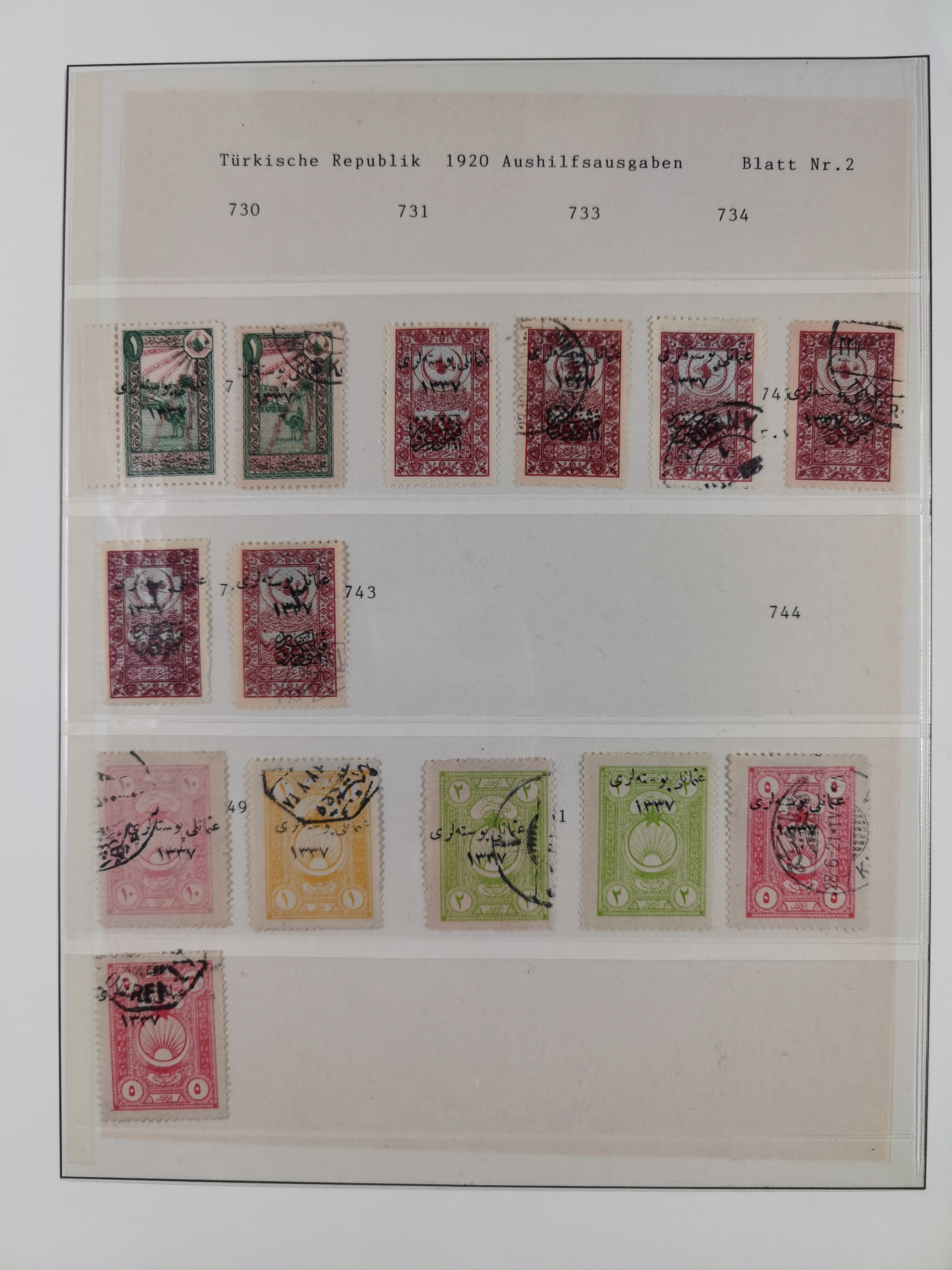 1920/69, mostly unused/mint and cancelled collection ‘Republic of Turkey’ in album with some better and complete issues Angora Government (Mi.705-708, 714-15, A721, 728H inverted and double), as well as some special items, including Mi. No. 754-766 unused (better signed or cert.), Sivas Railway (Mi. 913-934) unused. Many better stamps signed, condition from slightly flawed to flawless.