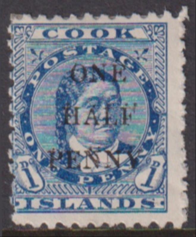 2267 M imageCook Isl 1899 ½d on 1d Makea, blue, p11. Ovpt variety, part of 1st N of PENNY missing, o/c. SG 21. Cat £35. HH mint. (Image)