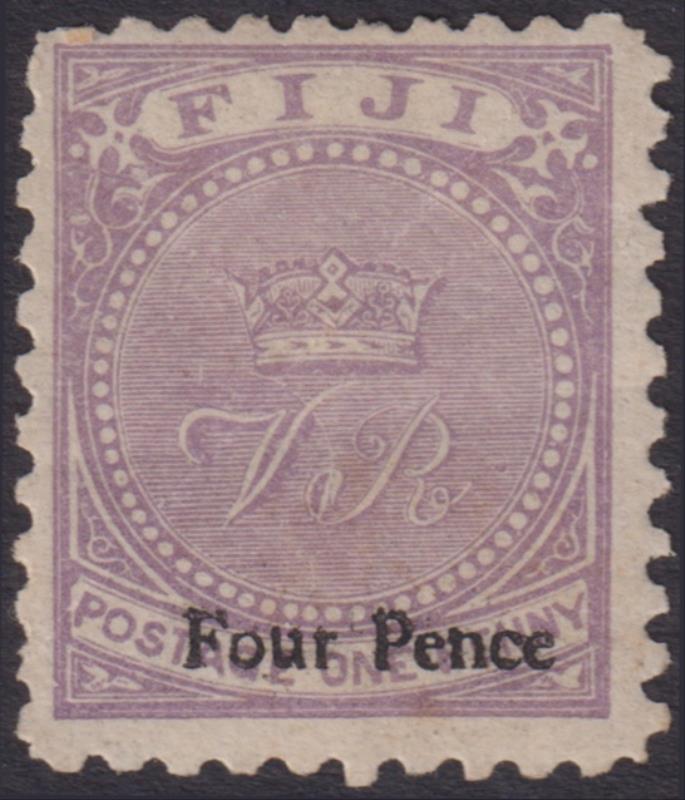 Fiji 1883 4d on 1d "Crown/VR" pale purple, p10 double crease not obvious from front. SG 42a. Cat £100. Mint. (Image)