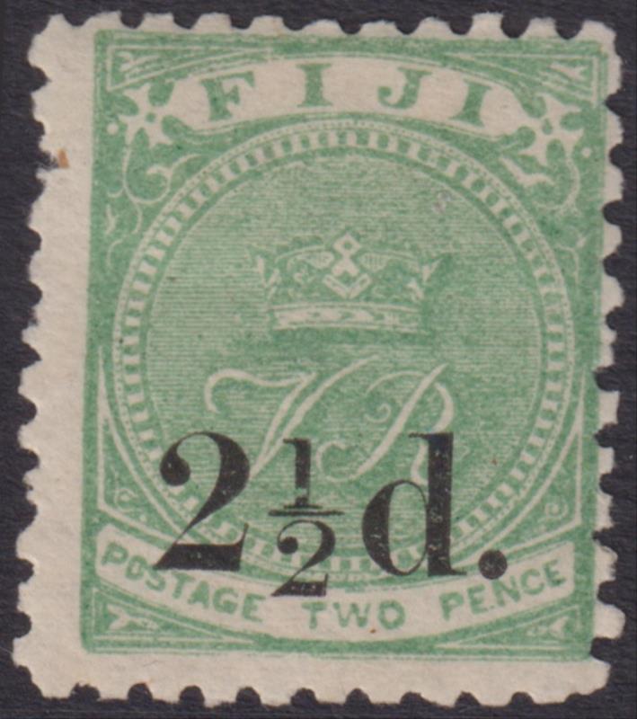 Fiji 1890 2½d on 2d green Crown/VR, p10. SG 70. Cat £50. Mint. (Image)