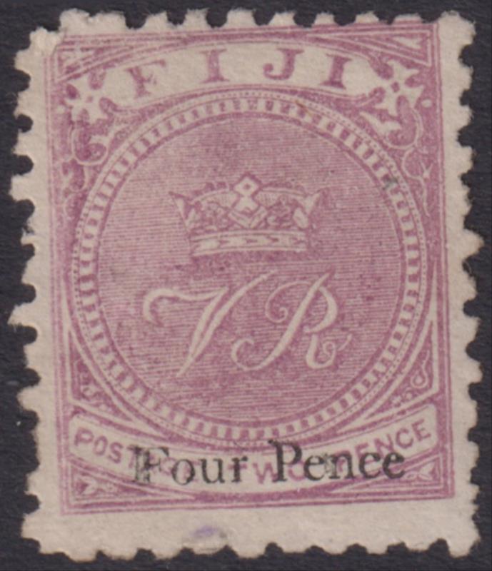 Fiji 1890 4d on 2d Crown/VR pale mauve, p10, fresh. SG 42. Cat £100. Mint. (Image)