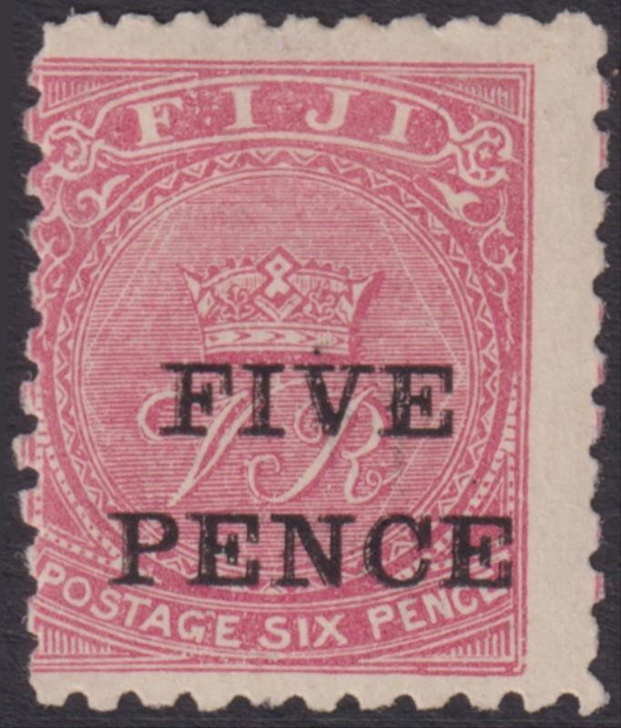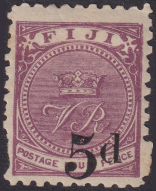 Fiji 1892 5d on 4d Crown/VR deep purple, p10 (3-4 side perf holes missing both sides). SG 73. Cat £70. Mint. (Image)