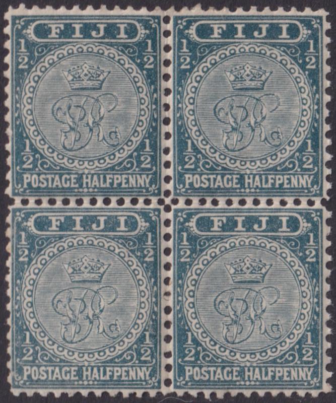 Fiji 1897 ½d Crown/VR greenish slate, p11¾ x 11 block of 4. SG 103b. Cat £36+. MUH. (Image)