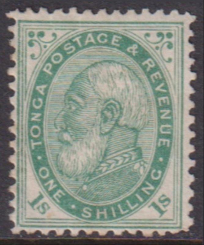 Tonga 1886 1/- King George I pale green, p12½, type 3 (oval with large break under "NG" of "SHILLING"). SG 4. Cat £110.