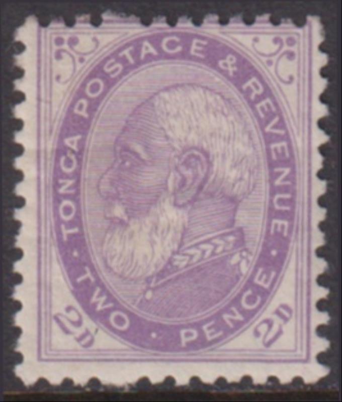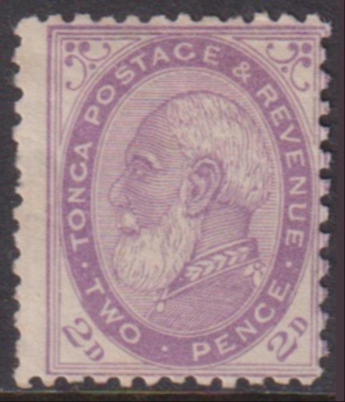 Tonga 1887 2d King George I pale violet, p12 x 11½, type 4 (oval broken under "TW" of "TWO" & under "CE" of "PENCE"). SG 2b.